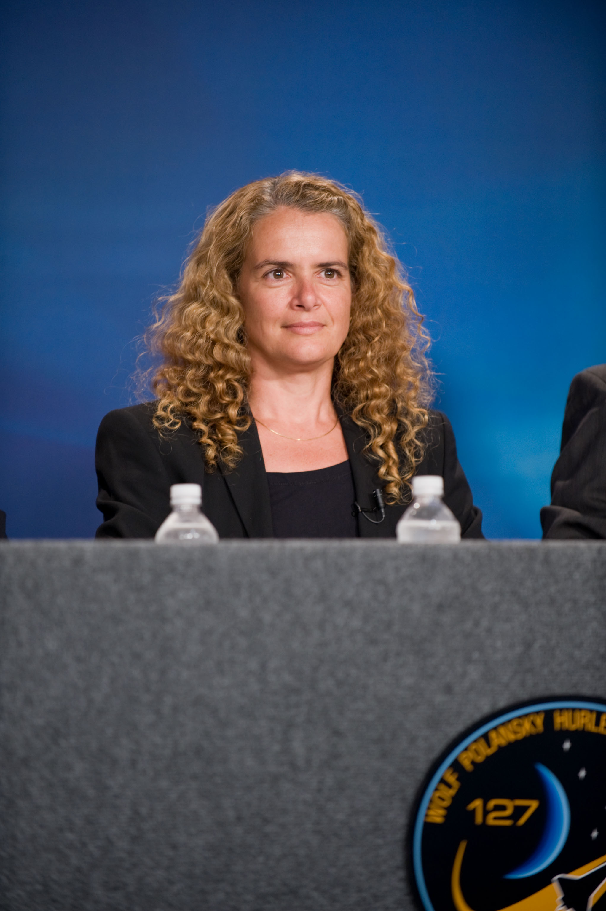 2009-05-28 - L’astronaute Julie Payette de l’Agence spatiale canadienne, spécialiste de mission du vol STS-127, répond à une question d’un journaliste au cours d’un point de presse pré-vol sur la mission STS-127 au Centre spatial Johnson de la NASA. (Source : NASA.)
