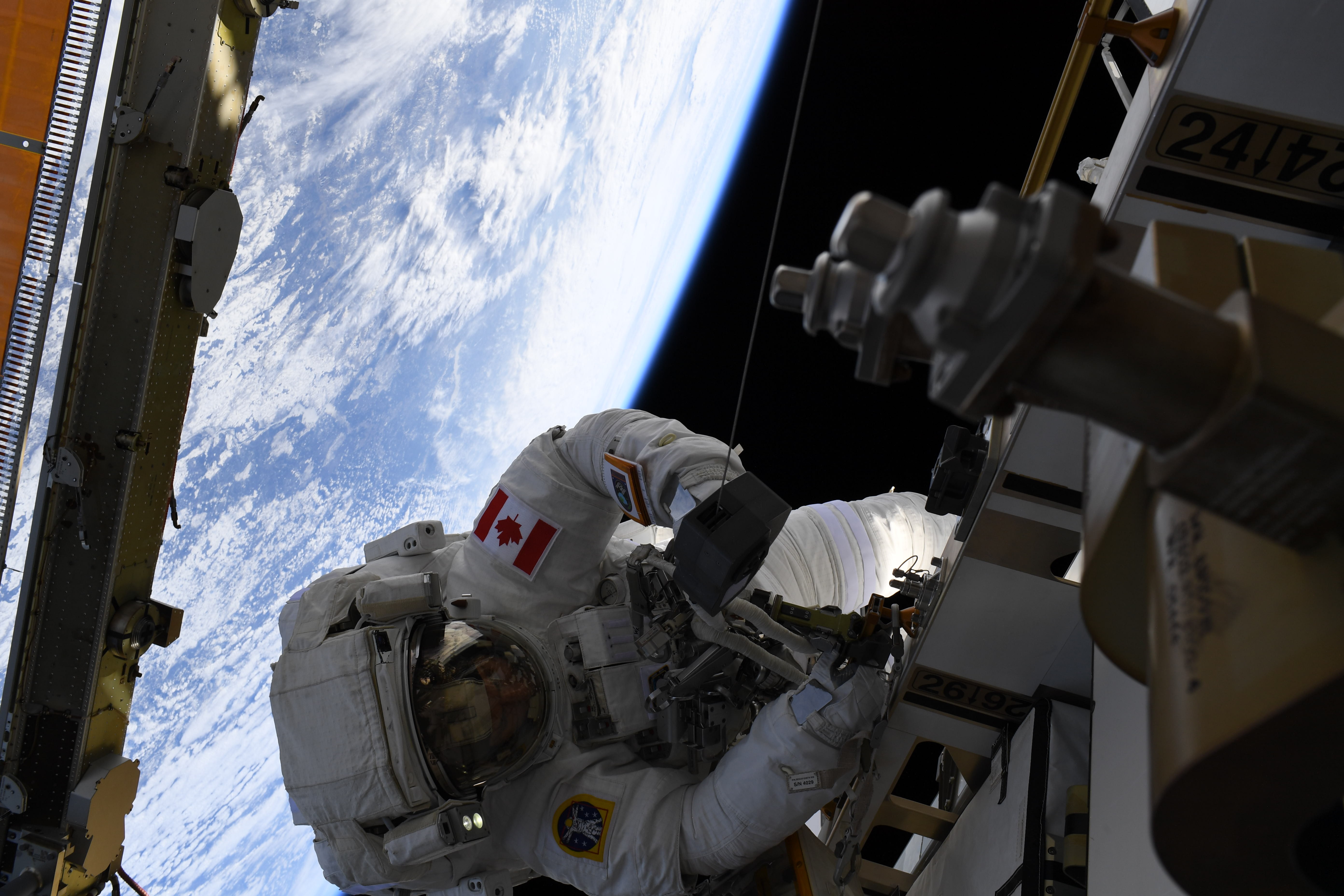 2019-04-08 - L’astronaute de l’Agence spatiale canadienne David Saint-Jacques effectue sa première sortie dans l’espace en compagnie de l'astronaute de la NASA Anne McClain. (Source : ASC/NASA.)
