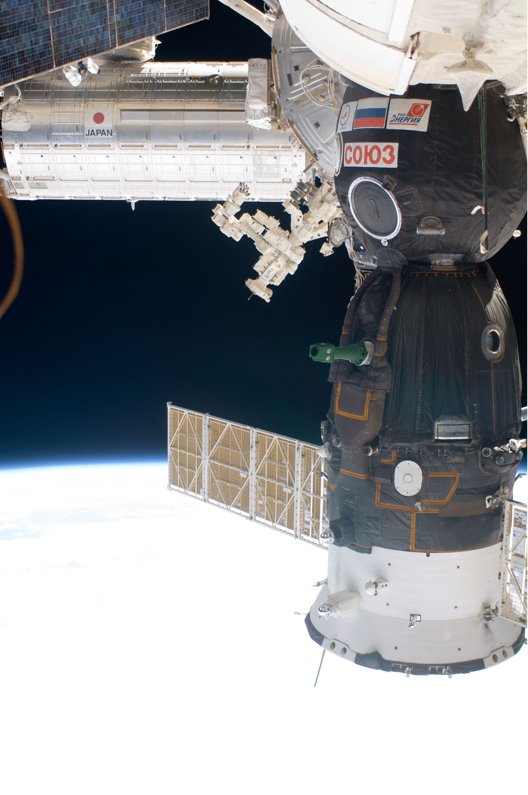 2009-06-16 - Vue à l’extérieur de la station : le module japonais Kibo, l’engin Soyouz russe amarré et, au centre, le manipulateur Dextre. (Source : NASA.)
