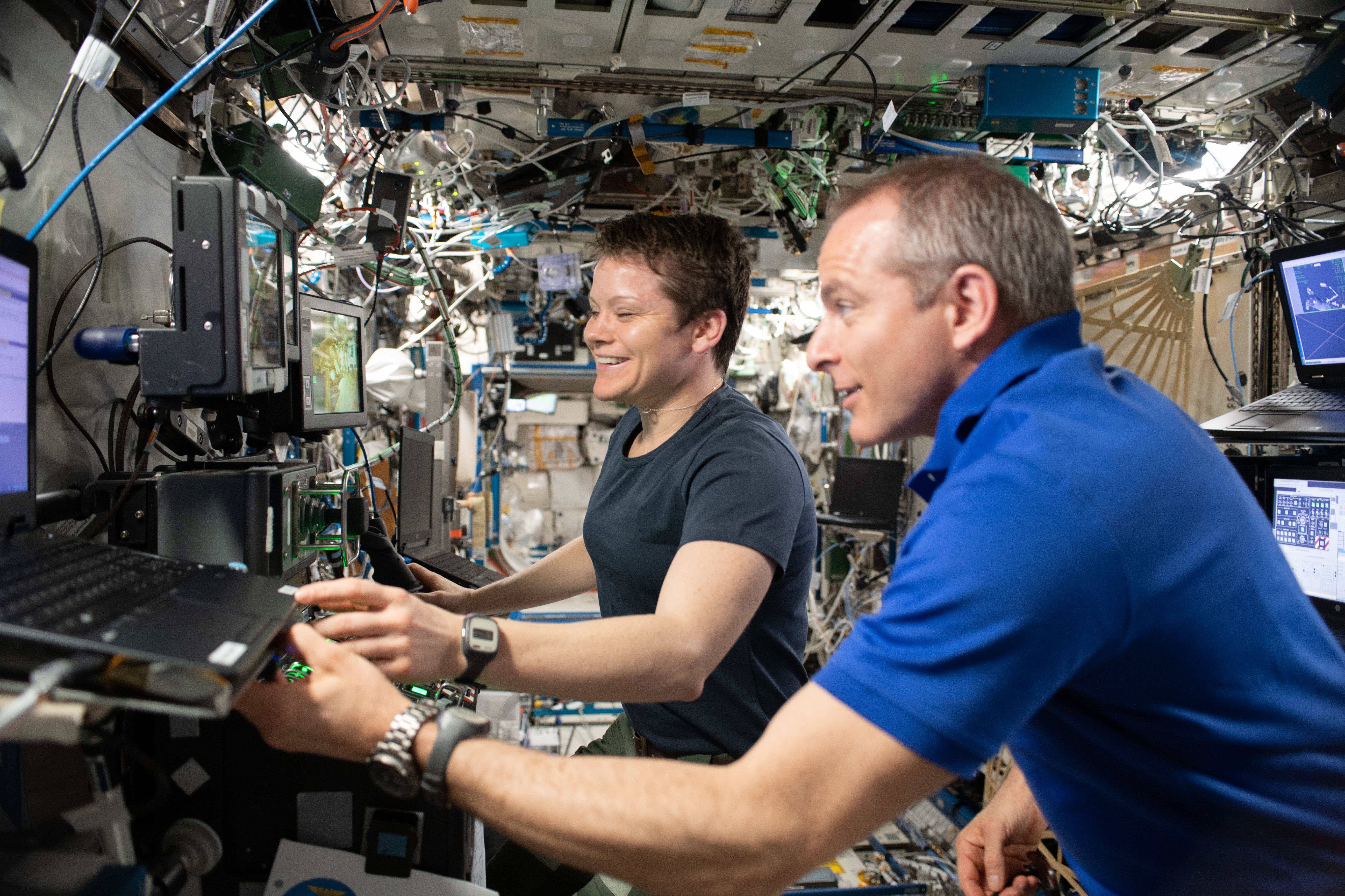 2019-04-16 - L’astronaute de l’ASC David Saint-Jacques et l’astronaute de la NASA Anne McClain s’exercent à commander le Canadarm2 avant l’arrivée, le 19 avril 2019, du vaisseau-cargo Cygnus de la société Northrop Grumman. (Source : ASC/NASA.)