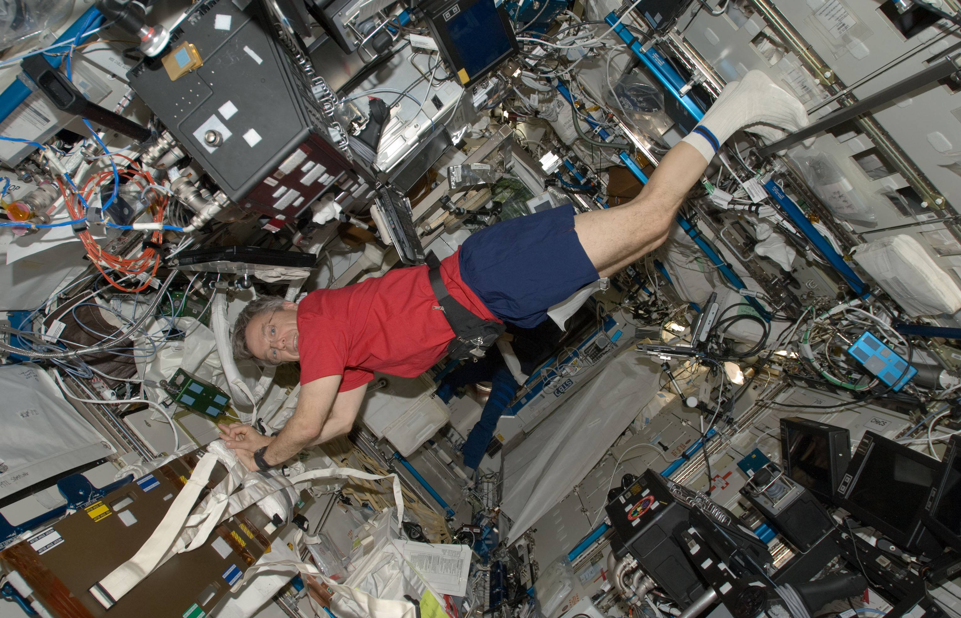 2009-07-02 - L’astronaute canadien Bob Thirsk participe à une séance d’entraînement aux urgences médicales utilisant les systèmes de soins de santé de l’équipage (CHeCS) situés dans le laboratoire Destiny de la Station spatiale internationale. (Source : NASA.)