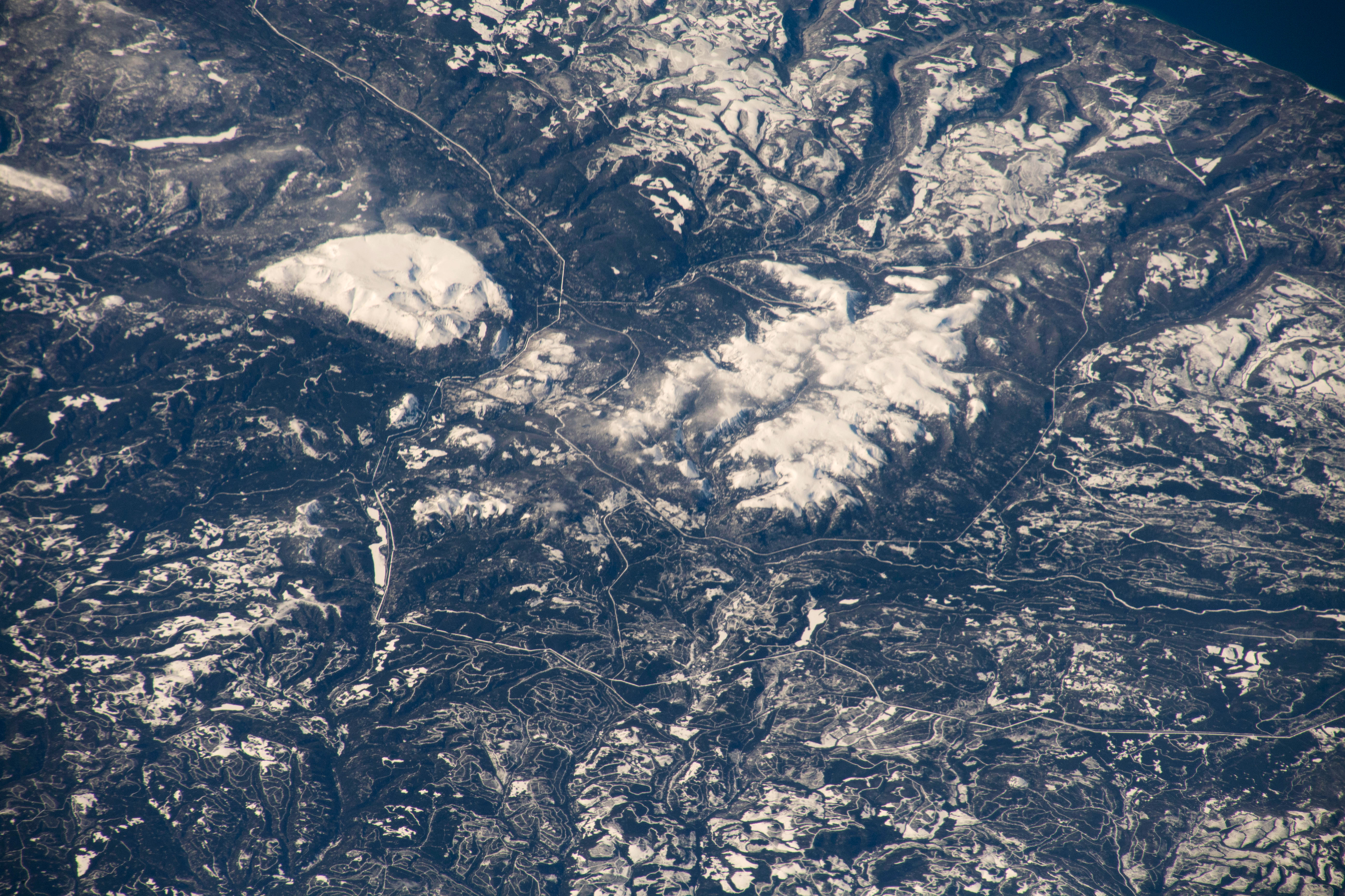 David Saint-Jacques dans les médias sociaux : Les monts Chic-Chocs en Gaspésie. On voit bien le plateau du mont Albert, paradis du ski hors-piste! (Source : ASC/NASA.)