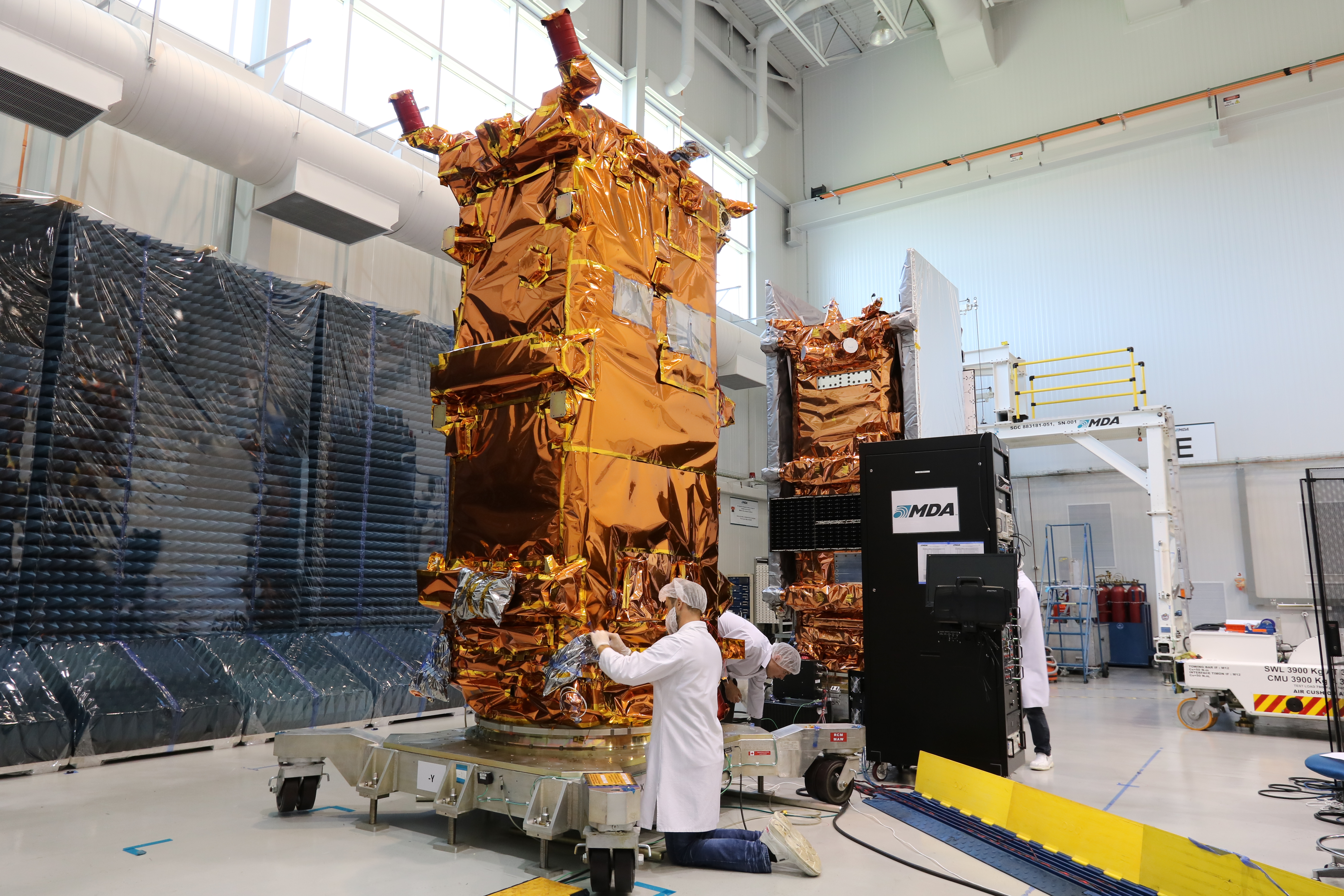 2017-02-22 – Préparation de deux des satellites de la MCR en vue d'un essai de résistance aux vibrations dans les laboratoires de MDA. La Constellation RADARSAT est la nouvelle génération de satellites d’observation de la Terre du Canada. Ces trois satellites identiques fournissent aux Canadiens des solutions à des défis importants. (Source : Agence spatiale canadienne.)