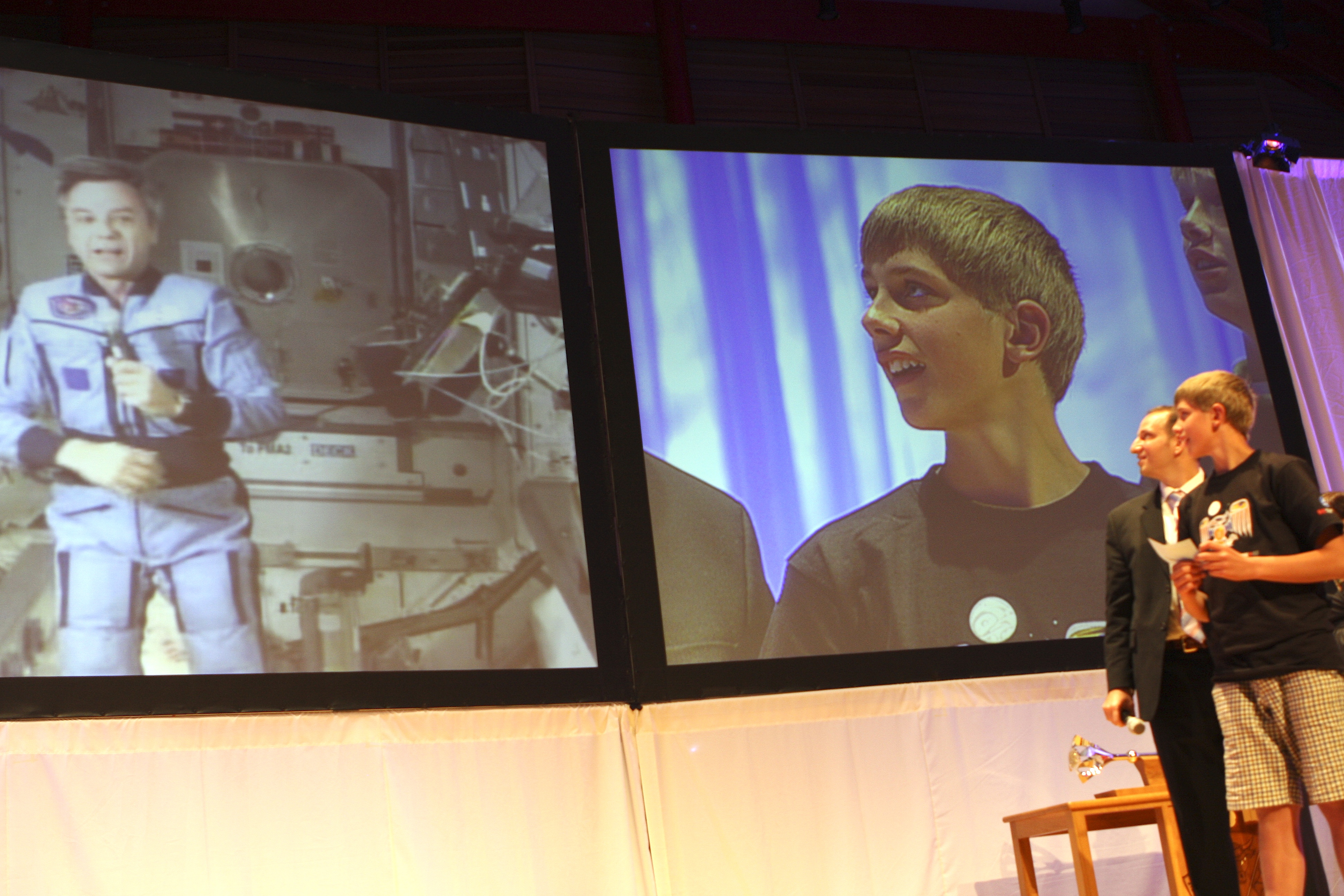 Le 8 juillet 2009, l'astronaute Robert Thirsk diplômé de l'Université de Calgary, est devenu le premier Canadien à recevoir un doctorat honorifique en droit par le biais d'une vidéoconférence depuis la Station spatiale internationale. Dans le cadre de cet événemenet, il a également échangé avec des étudiants participant au camps d'été « Minds in motion ». Photo : Stephanie Leblond/Jade Media, gracieuseté de l'Université de Calgary. (Source : Université de Calgary.)