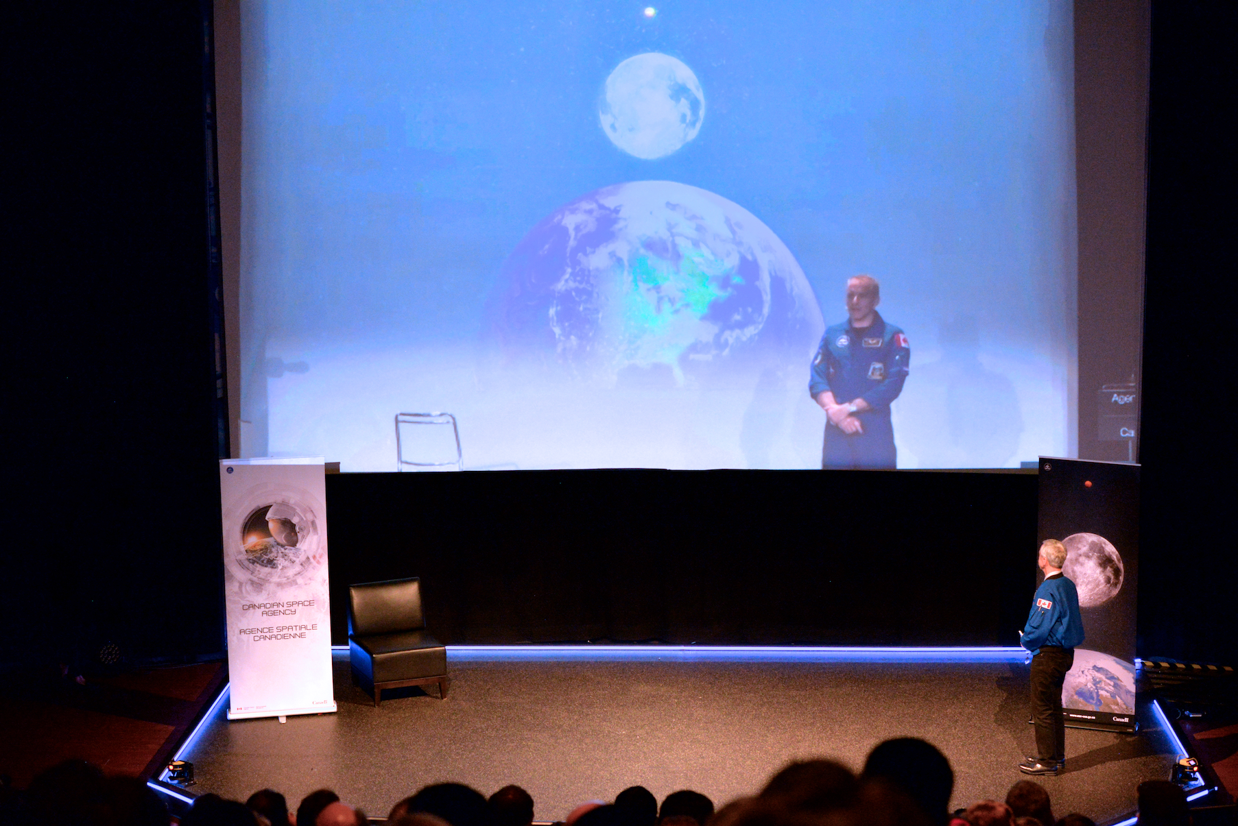 Les astronautes canadiens David Saint-Jacques (au Centre des sciences de Montréal) et Robert Thirsk (au Centre des sciences de l'Ontario) ont communiqué par vidéoconférence pour discuter de la riche histoire de l'exploration spatiale habitée et de son avenir prochain. (Source : Agence spatiale canadienne.)