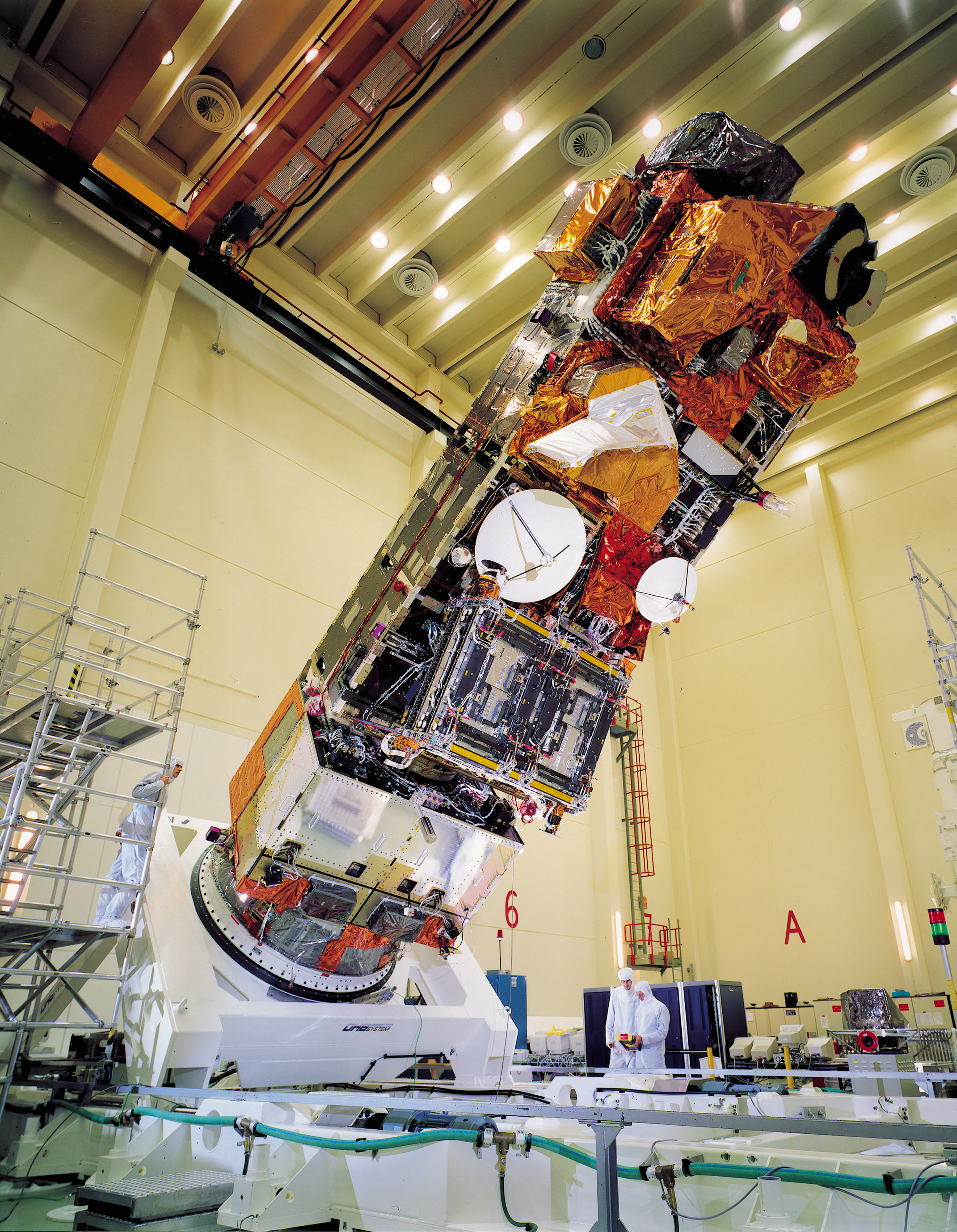 ENVISAT est un satellite d'observation de la Terre très perfectionné comportant une combinaison unique de capteurs qui améliorent grandement la portée et la précision des mesures scientifiques de l'atmosphère, des océans, de la surface des terres et des glaces. Ses capacités dépassent largement celles de tous les satellites d'observation de la Terre précédents ou prévus. Il sera lancé en 2002 au moyen d'une fusée Ariane 5. Cette image montre l'intégration du modèle de vol de la plate-forme polaire/ENVISAT au Centre européen de recherche et de technologies spatiales de l'Agence spatiale européenne. (Source : ESA.)