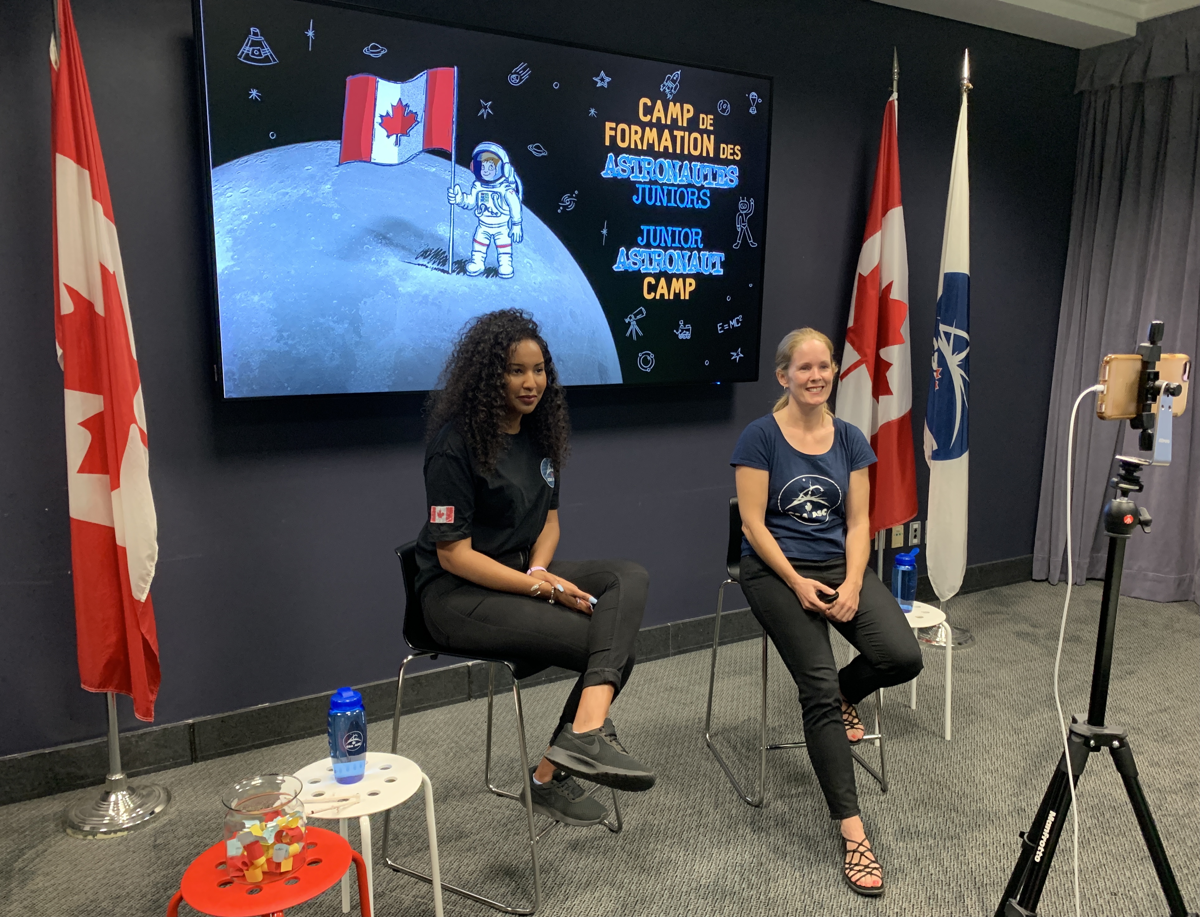 Les ingénieures Jamie Sevigny et Miriam Micael, les animatrices du camp, souhaitent la bienvenue aux participants depuis le siège social de l'ASC. (Source : Agence spatiale canadienne.)