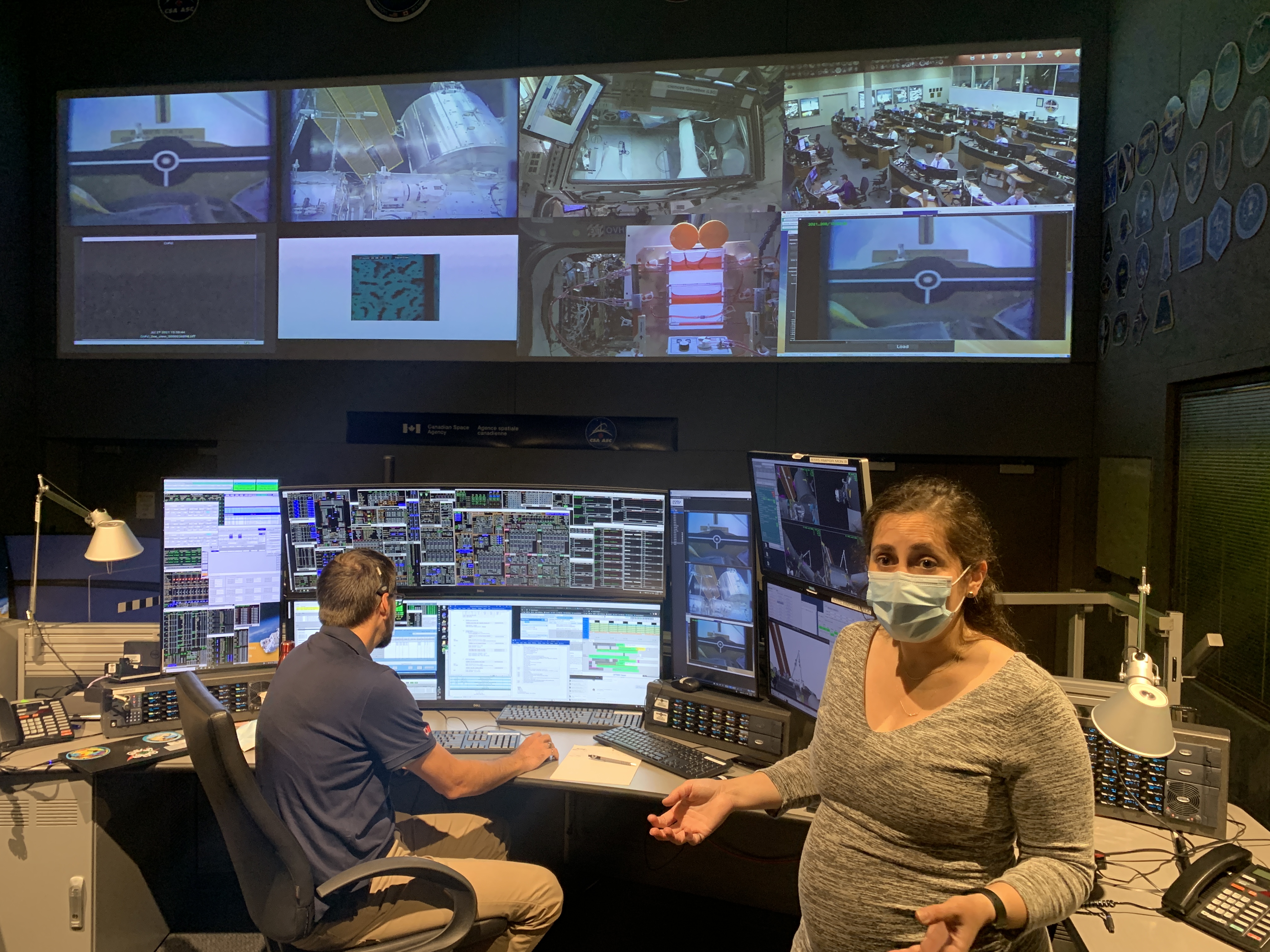 Le centre de contrôle de la robotique de l'ASC est doté des mêmes capacités que le centre de contrôle de mission de la NASA à Houston, au Texas. Saviez-vous que des opérations du Canadarm2 et de Dextre sont effectuées à partir de l'ASC? Sur la photo, on peut voir Kristen Facciol et son collègue Jason Seagram, alors bien occupé aux commandes du Canadarm2. (Source : Agence spatiale canadienne.)