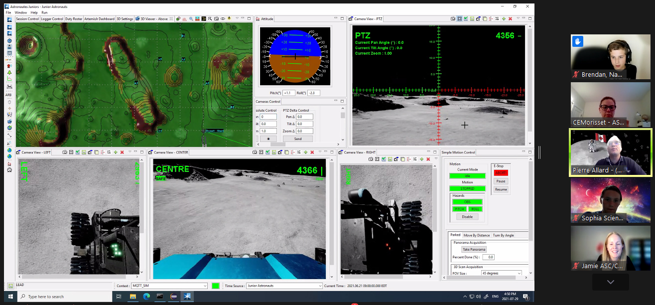 La pluie a gêné les opérations de quelques équipes, comme l'équipe Chawla (ce qui n'arriverait pas sur la Lune!). Nous avons donc, dans ces cas, utilisé un monde simulé créé à l'aide d'un outil de développement de moteur de jeu et des milliers d'images du terrain traitées pour ressembler à la Lune. (Source : Agence spatiale canadienne.)