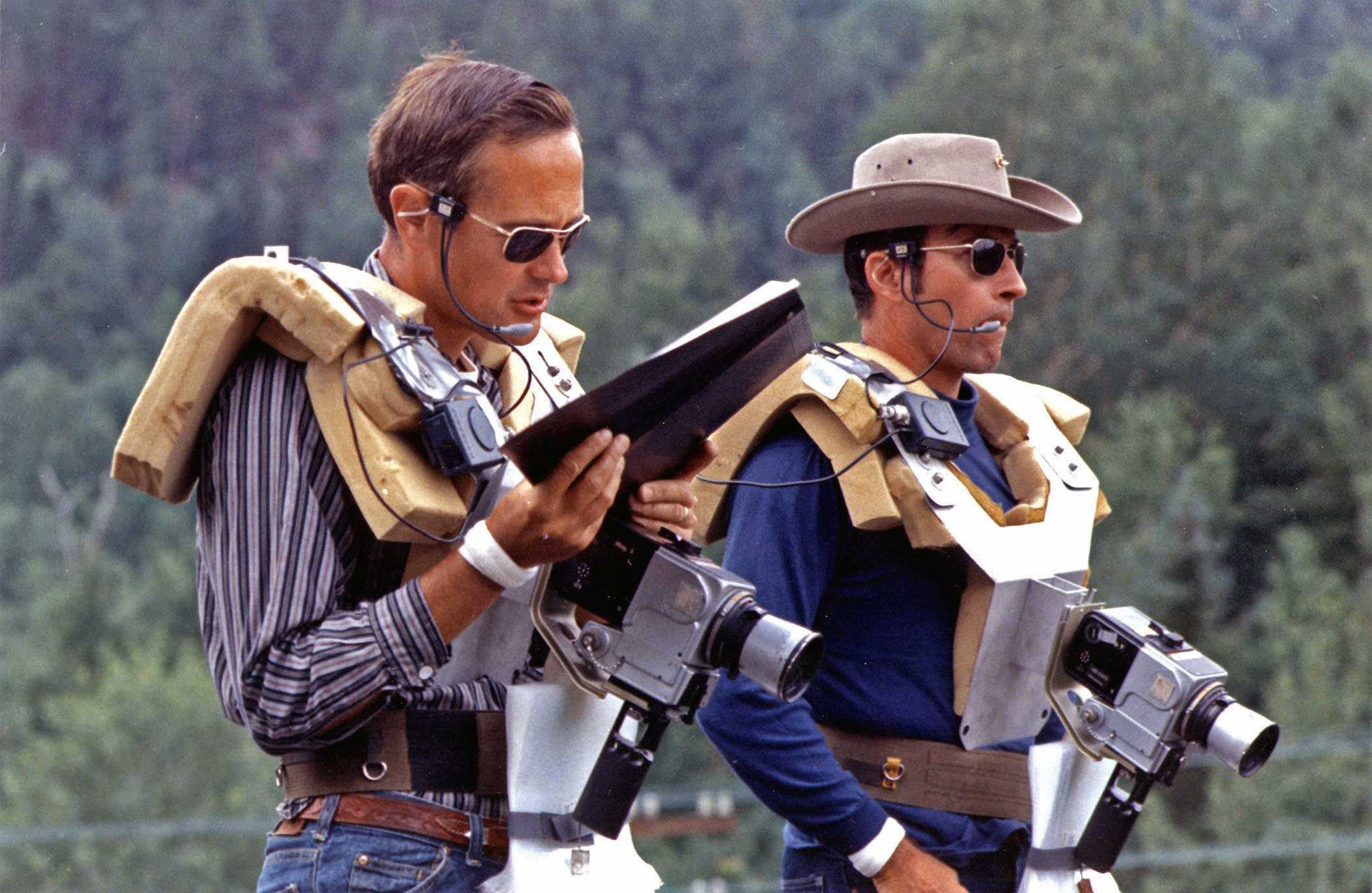 Les astronautes d'Apollo 16 Charlie Duke (à gauche) et John Young en formation à Sudbury, en Ontario, en juillet 1971. Ils portent des appareils photo électriques Hasselblad semblables à ceux qu'ils ont utilisés sur la Lune. (Source : NASA.)