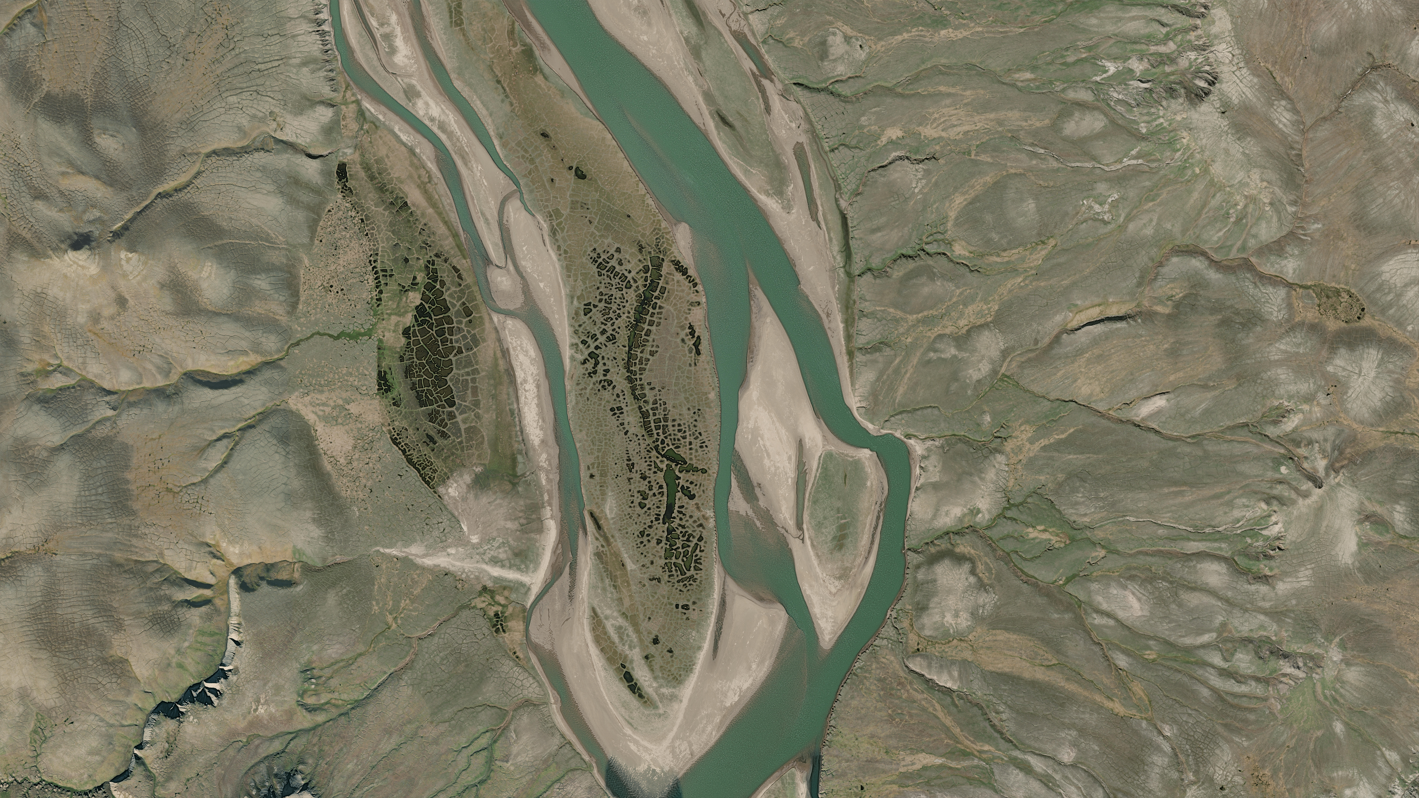 La rivière Thomsen traverse du sud au nord le parc national Aulavik sur l'ile Banks, dans les Territoires du Nord-Ouest. (Sources : Maxar Technologies, Esri Canada Limited, Esri World Imagery Service.)
