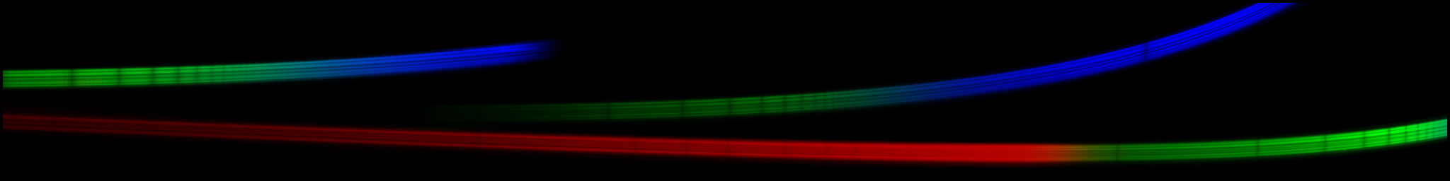 2022-06-27 - Image de test obtenue avec le NIRISS en mode SOSS pendant qu'il cible une étoile brillante. Chaque couleur correspond à une longueur d'onde précise dans l'infrarouge comprise entre 0,6 et 2,8 microns. Les lignes noires dans les spectres sont la signature des atomes d'hydrogène présents dans l'étoile. Le NIRISS est une contribution de l'Agence spatiale canadienne. Il fournit des capacités d'observation uniques en complément des autres instruments embarqués sur le télescope Webb. (Sources : Agence spatiale canadienne, NASA, Loïc Albert, Université de Montréal, Équipe NIRISS.)