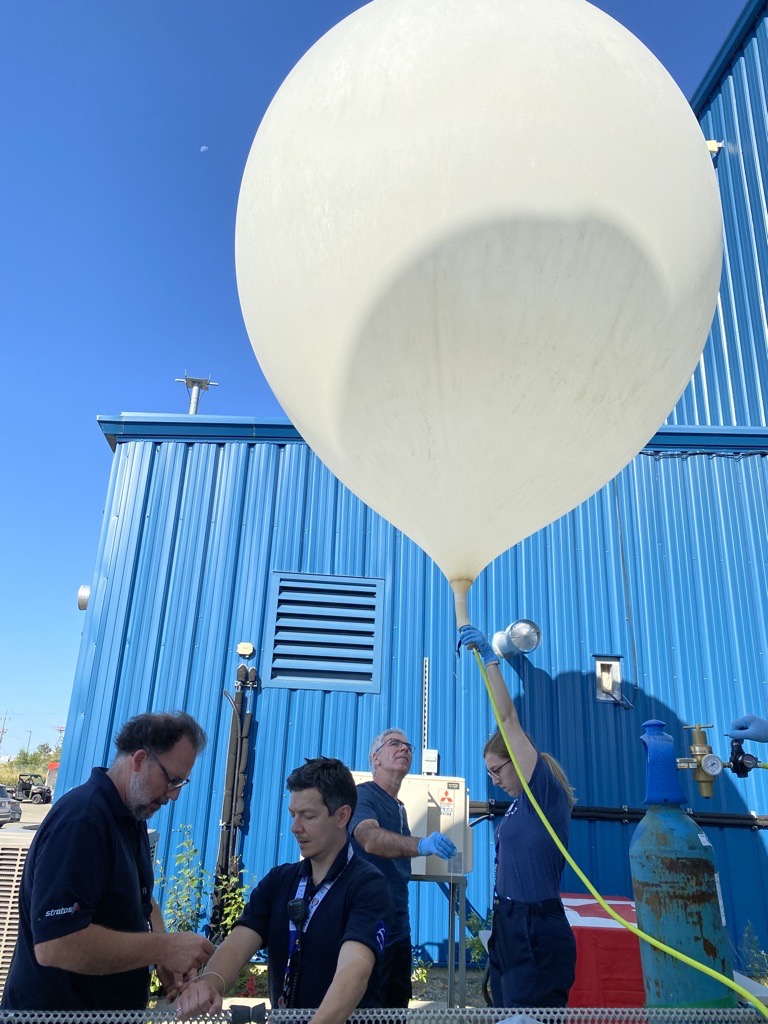 2022-08-18 - Des emloyés de l'ASC gonflent le ballon contenant des charges utiles de jeunes d'écoles secondaires de la région de Timmins. (Source : Agence spatiale canadienne.)