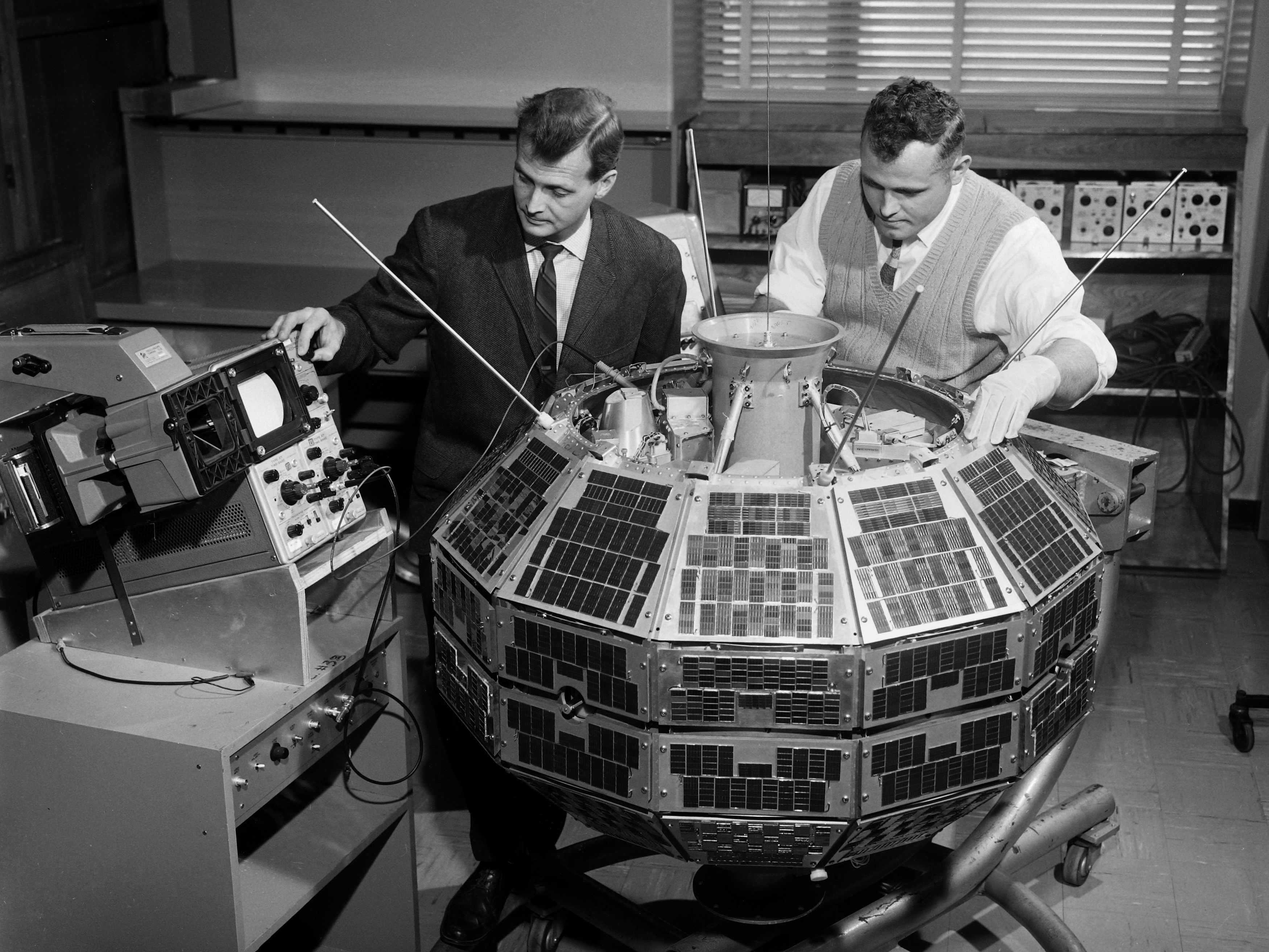 Peter Townsend et Bert Schriber testent le matériel électrique du satellite Alouette I. (Source : Centre de recherches sur les communications Canada (CRC).)