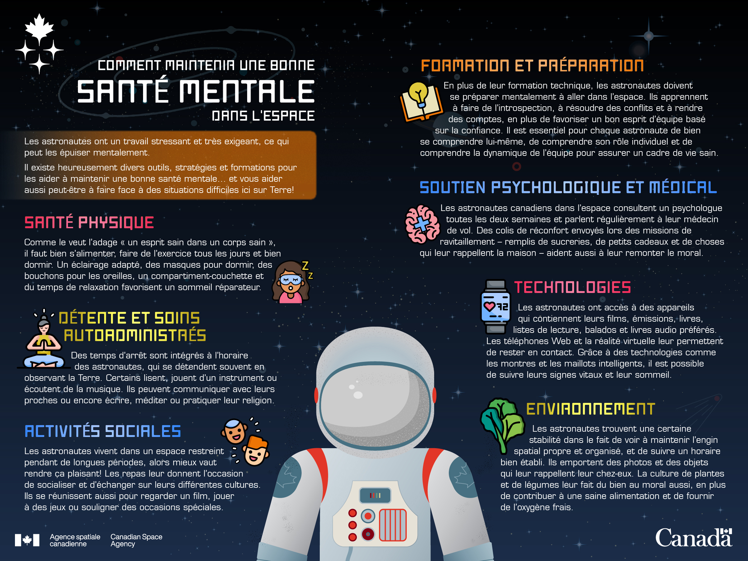 Les astronautes ont un travail stressant et très exigeant, ce qui peut les épuiser mentalement. Il existe heureusement divers outils, stratégies et formations pour les aider à maintenir une bonne santé mentale… et vous aider aussi peut-être à faire face à des situations difficiles ici sur Terre! (Source : Agence spatiale canadienne.)