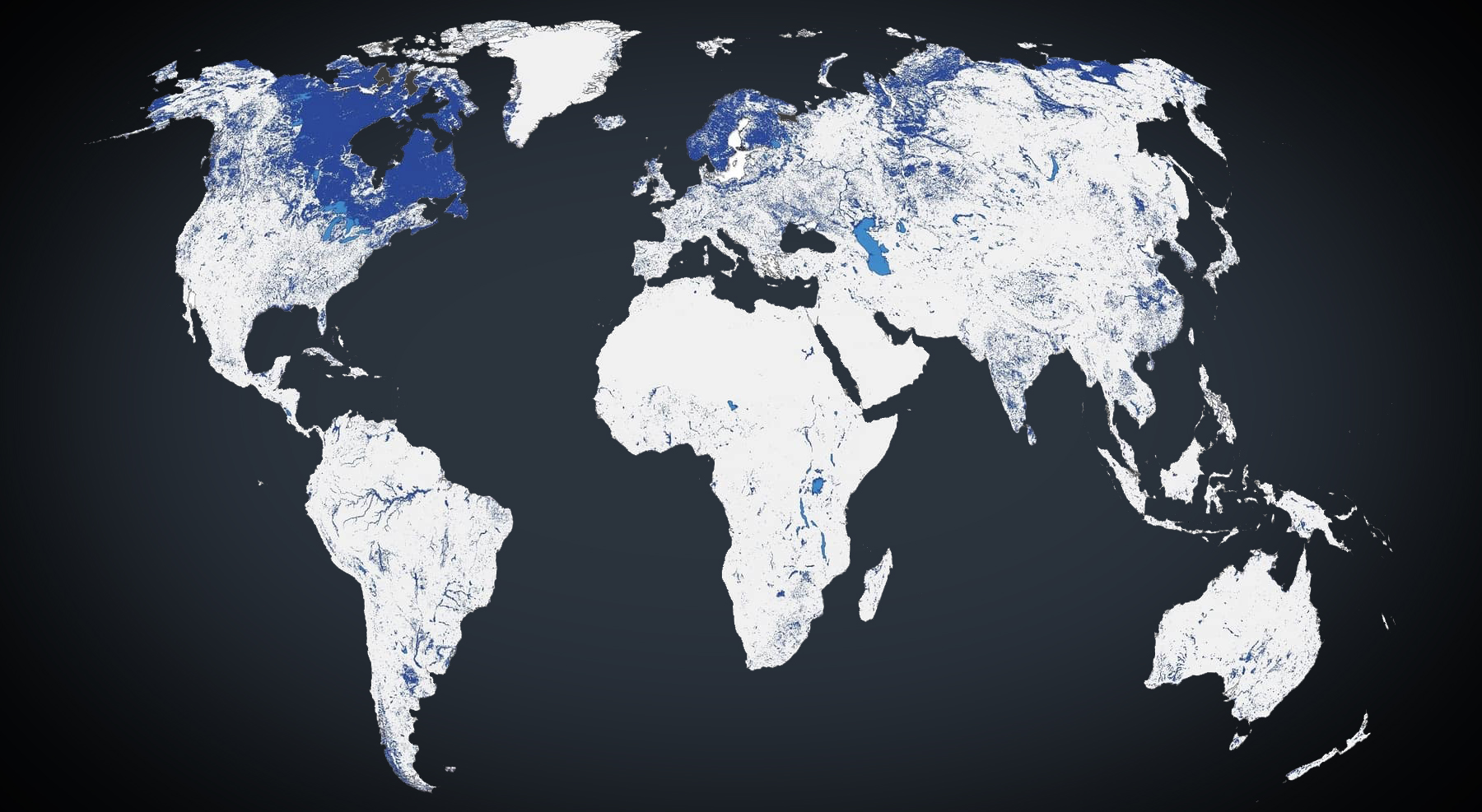 2023-01-18 – Les lacs du Canada représentent 62 % de tous les lacs du monde (en bleu). (Source : HydroLAKES.)