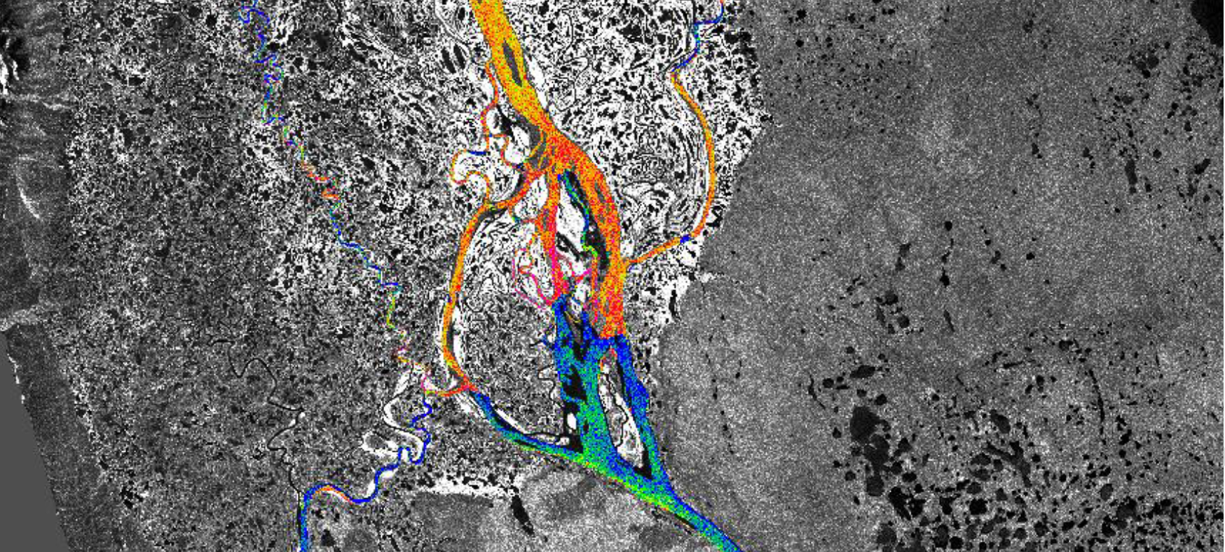 2023-04-04 – Cette image satellitaire du fleuve Mackenzie dans les Territoires du Nord-Ouest prise le 1er juin 2021 montre la présence de glace. L'eau libre est en bleu et la glace lisse, dans des teintes de vert. L'orange, le rouge et le rose représentent la glace consolidée, de rugueuse à très rugueuse. Les embâcles se forment dans les parties rose et rouges du fleuve. (Source : Image de la mission de la Constellation RADARSAT © Gouvernement du Canada [2021]. RADARSAT est une marque officielle de l'Agence spatiale canadienne. Données traitées par Ressources naturelles Canada.)