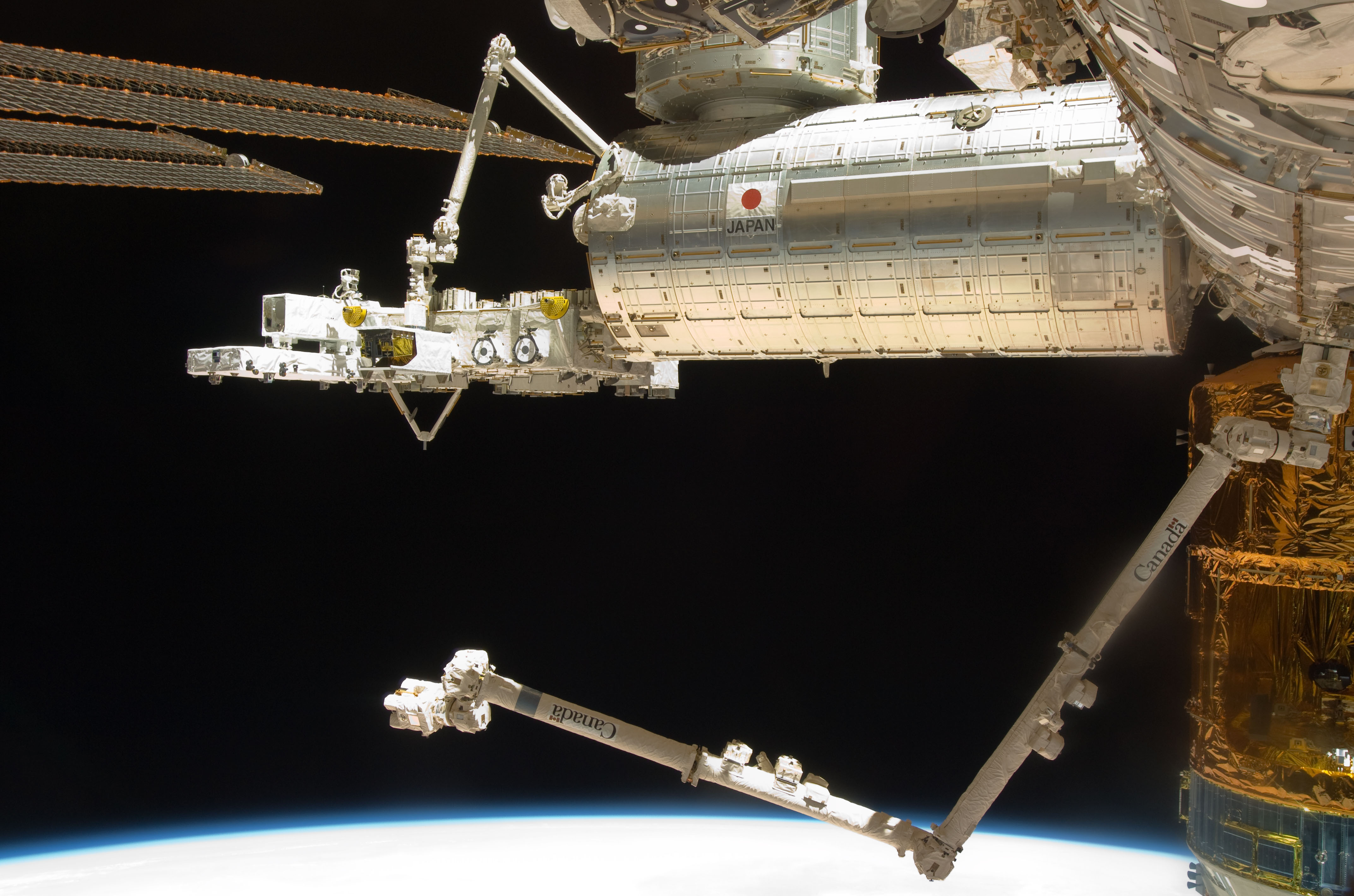2009-09-24 - Le Canadarm2, actionné par l’astronaute de l’Agence spatiale canadienne Robert Thirsk, est en position d’attente tandis que le bras robot japonais retire deux charges utiles de la palette exposée au vide spatial et les installe sur la plateforme extérieure du module Kibo. (Source : NASA.)