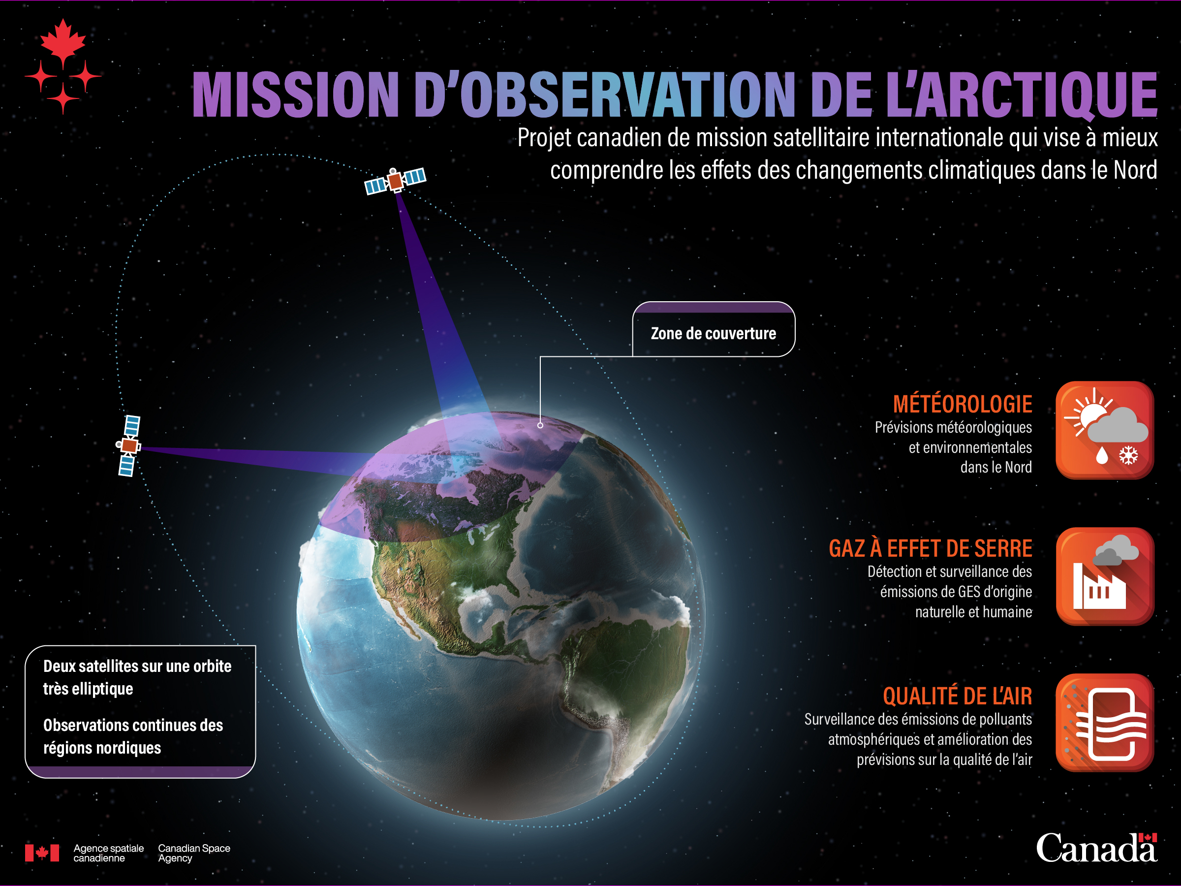 Infographie intitulée « Mission d'observation de l'Arctique » avec le sous-titre « Projet canadien de mission satellitaire internationale qui vise à mieux comprendre les effets des changements climatiques dans le Nord ».