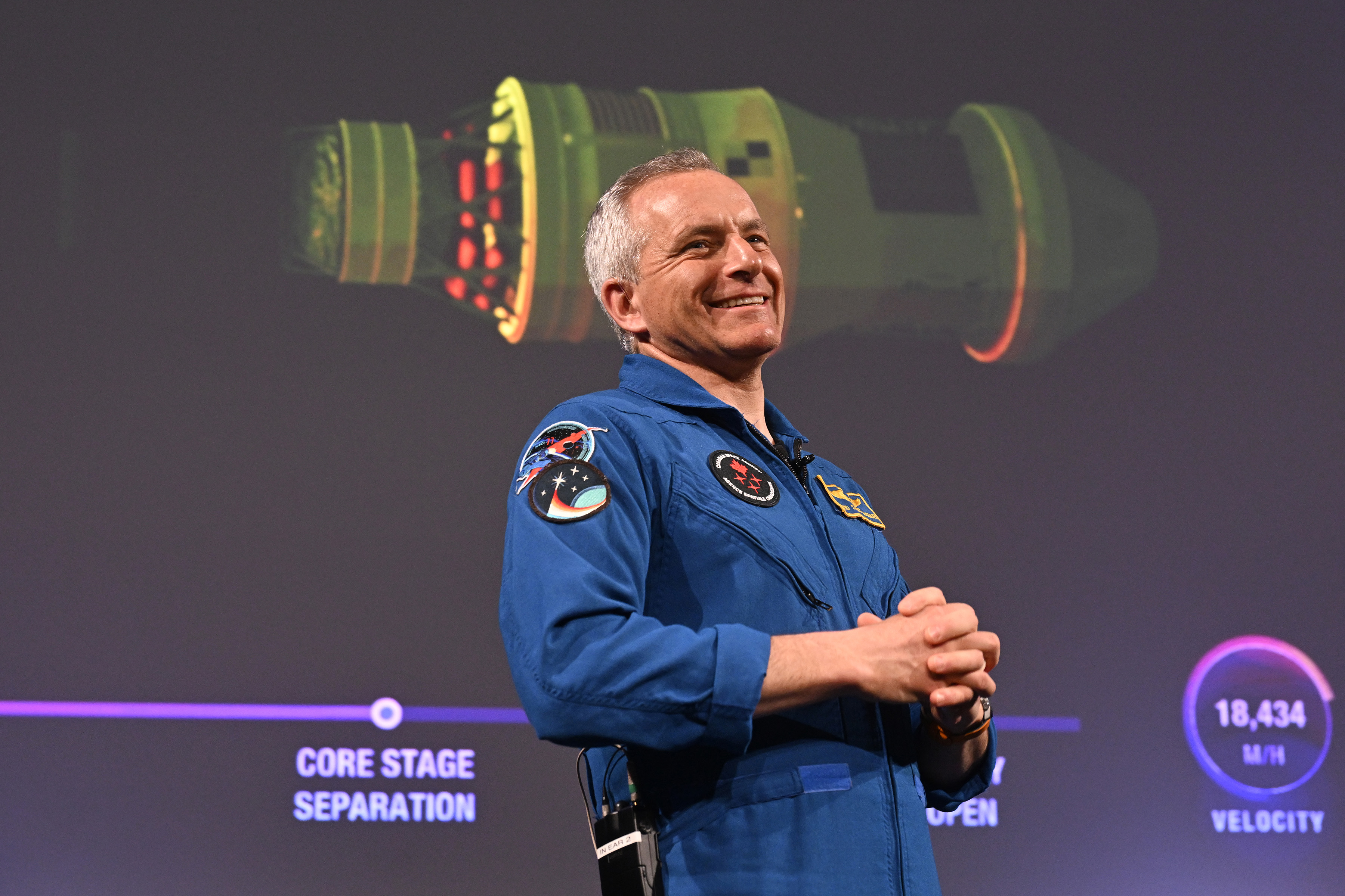 L'astronaute David Saint-Jacques prend la parole lors de l'évènement de lancement de la mission Artemis II à l'Agence spatiale canadienne