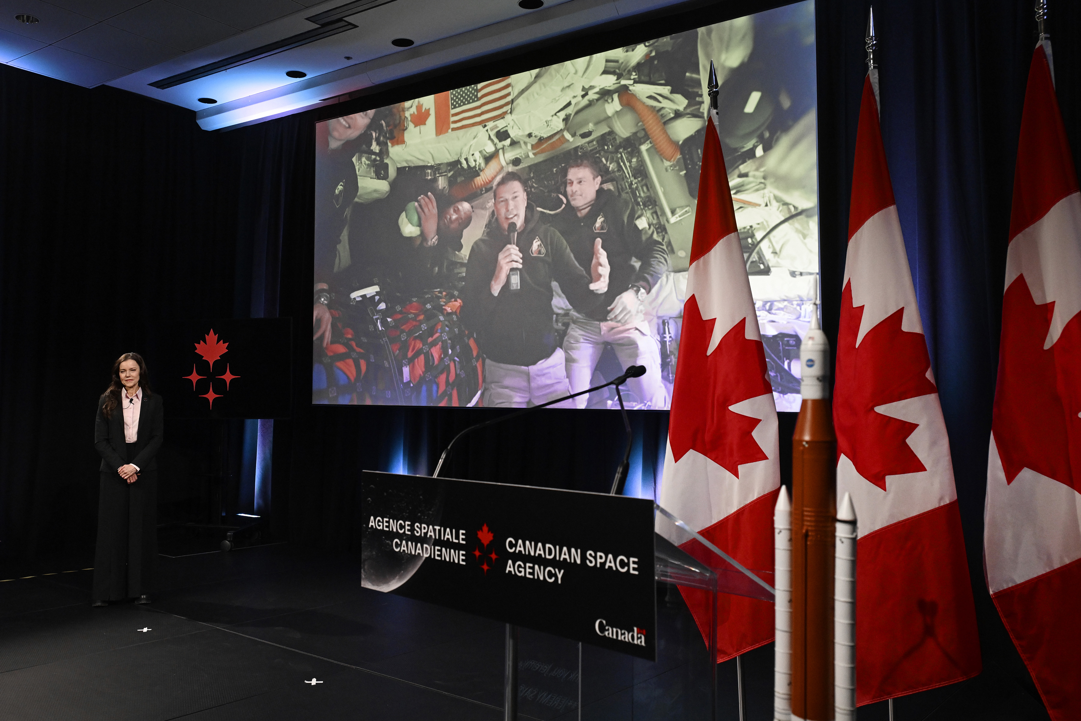 Les membres d'équipage d'Artemis II, y compris l'astronaute de l'Agence spatiale canadienne Jeremy Hansen, sont projetés sur grand écran lors d'une vidéocommunication en direct avec la Terre. (Source : Agence spatiale canadienne.)