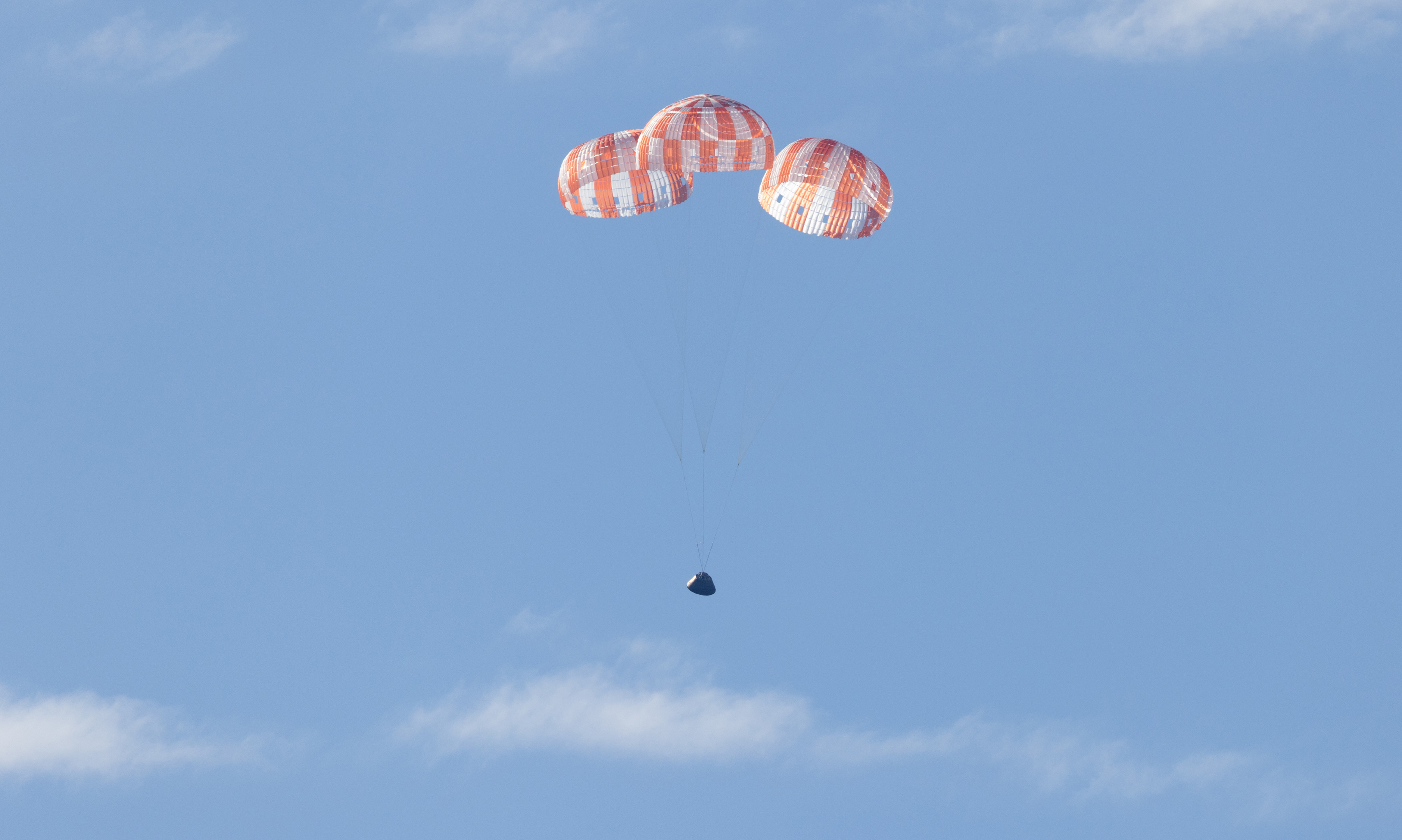 La capsule Orion descend vers l'océan Pacifique, ses parachutes déployés, peu avant l'amerrissage qui marquera la fin de la mission historique Artemis II. (Source : NASA.)