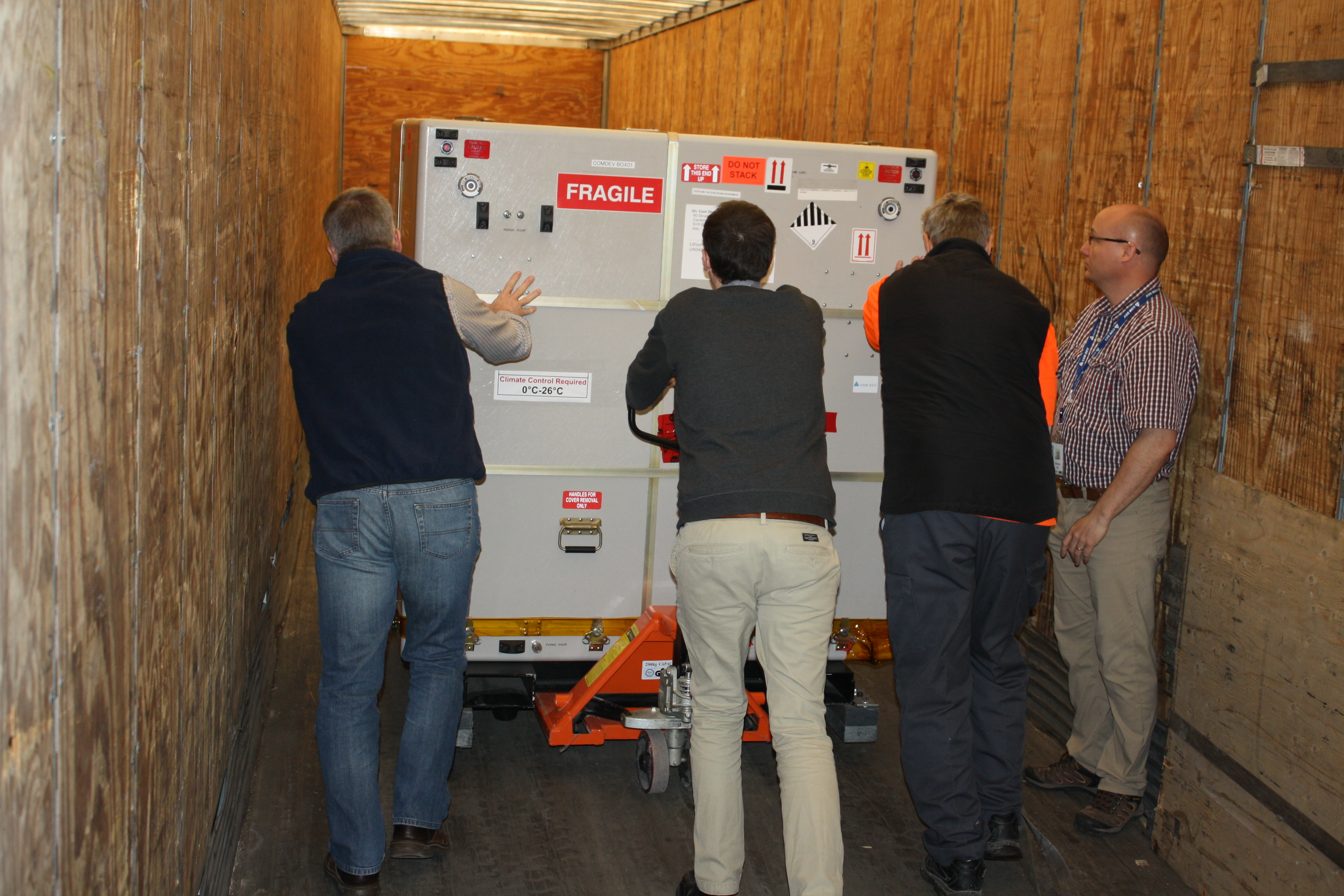 2016-05-02 - Le microsatellite canadien M3MSat est soigneusement préparé pour son transport vers l’Inde en vue de son lancement planifié le 9 juin 2016. (Source : Agence spatiale canadienne.)