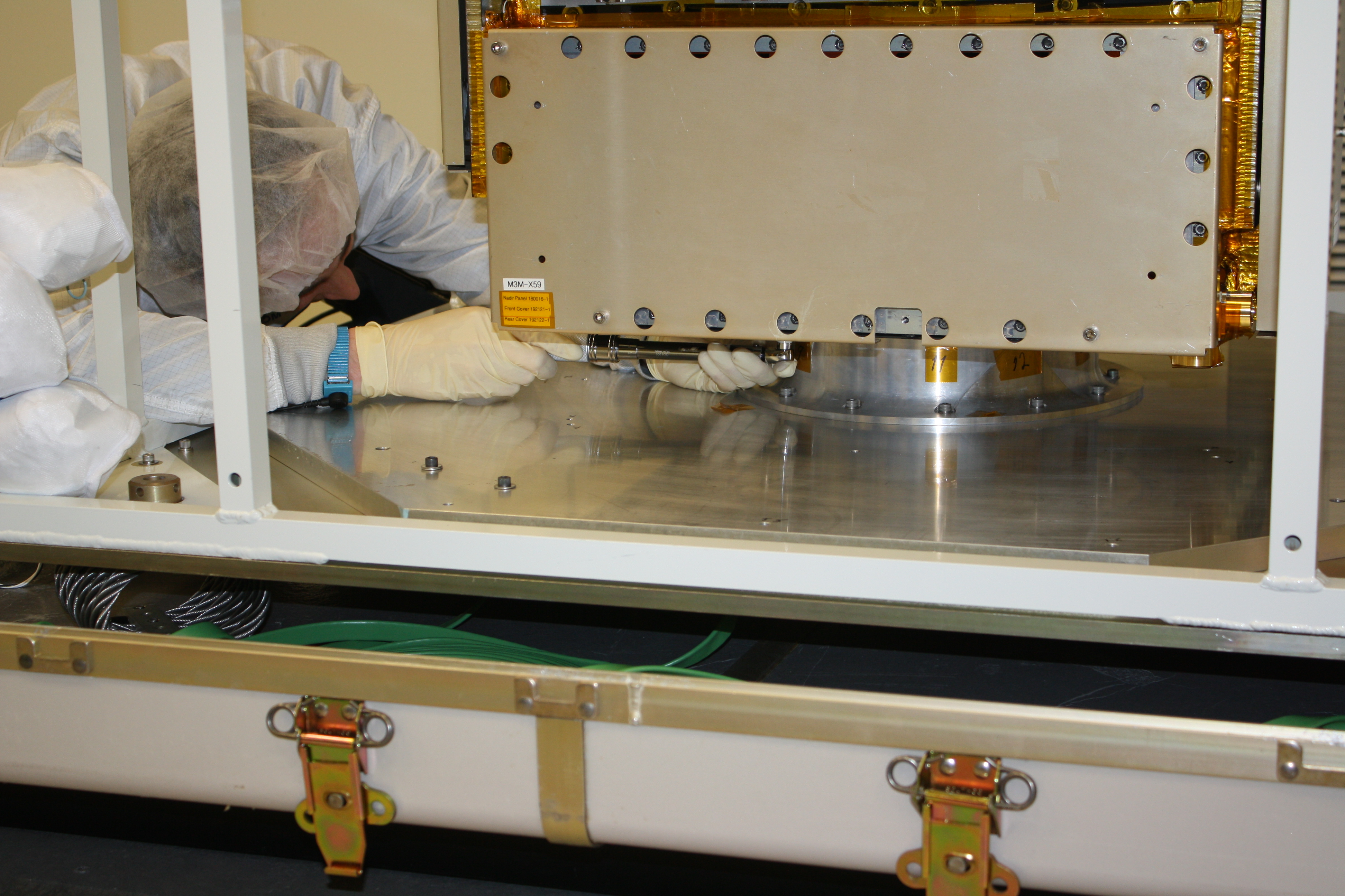 2016-05-02 - Le microsatellite canadien M3MSat est soigneusement préparé pour son transport vers l’Inde en vue de son lancement planifié le 9 juin 2016. (Source : Agence spatiale canadienne.)
