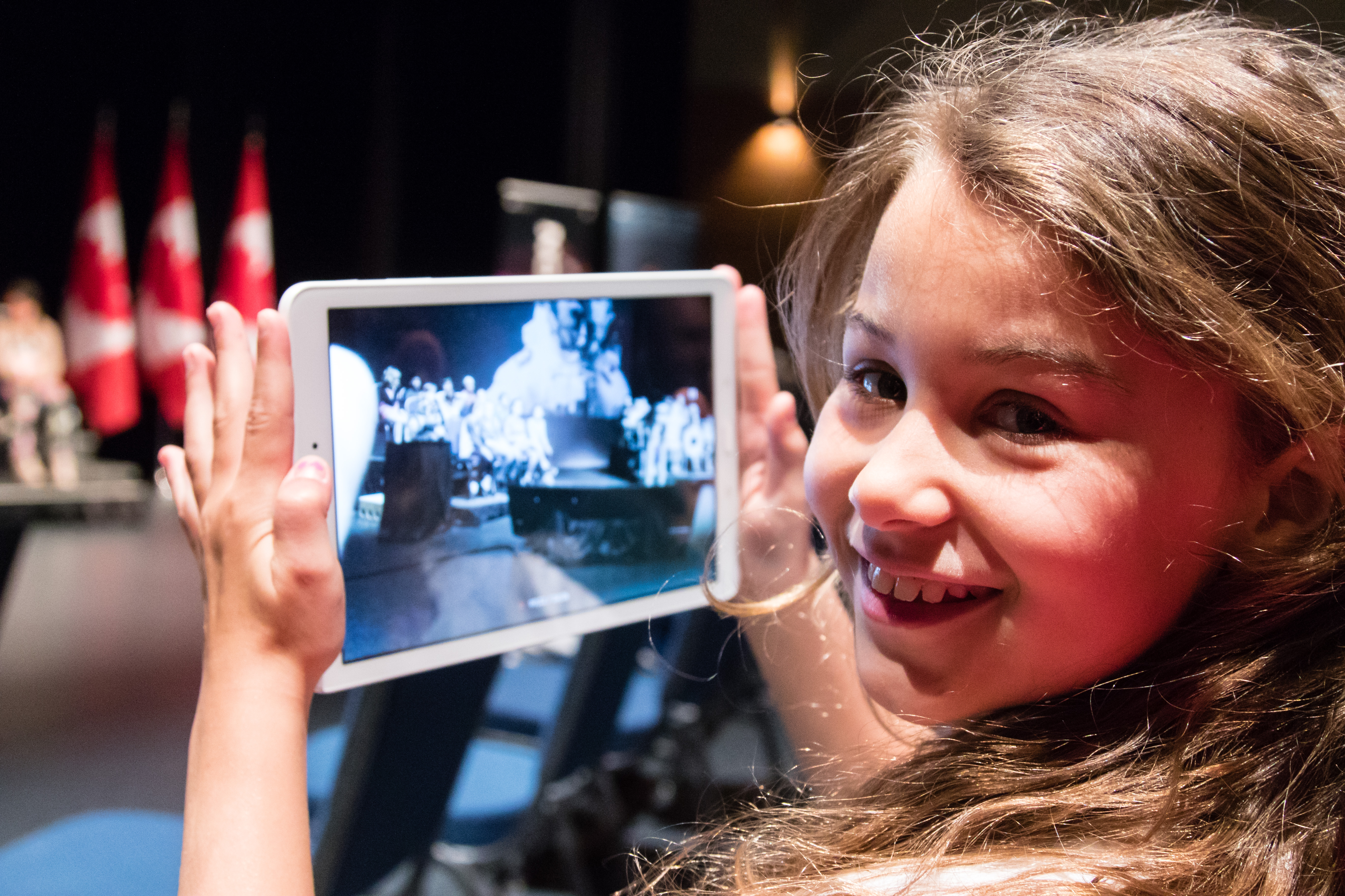 2016-05-16 - Une fillette est tout sourire pendant l'annonce de l'affectation de l'astronaute canadien David Saint-Jacques à la mission Expedition 58/59 d'une durée de six mois à bord de la Station spatiale internationale. (Source : Agence spatiale canadienne.)