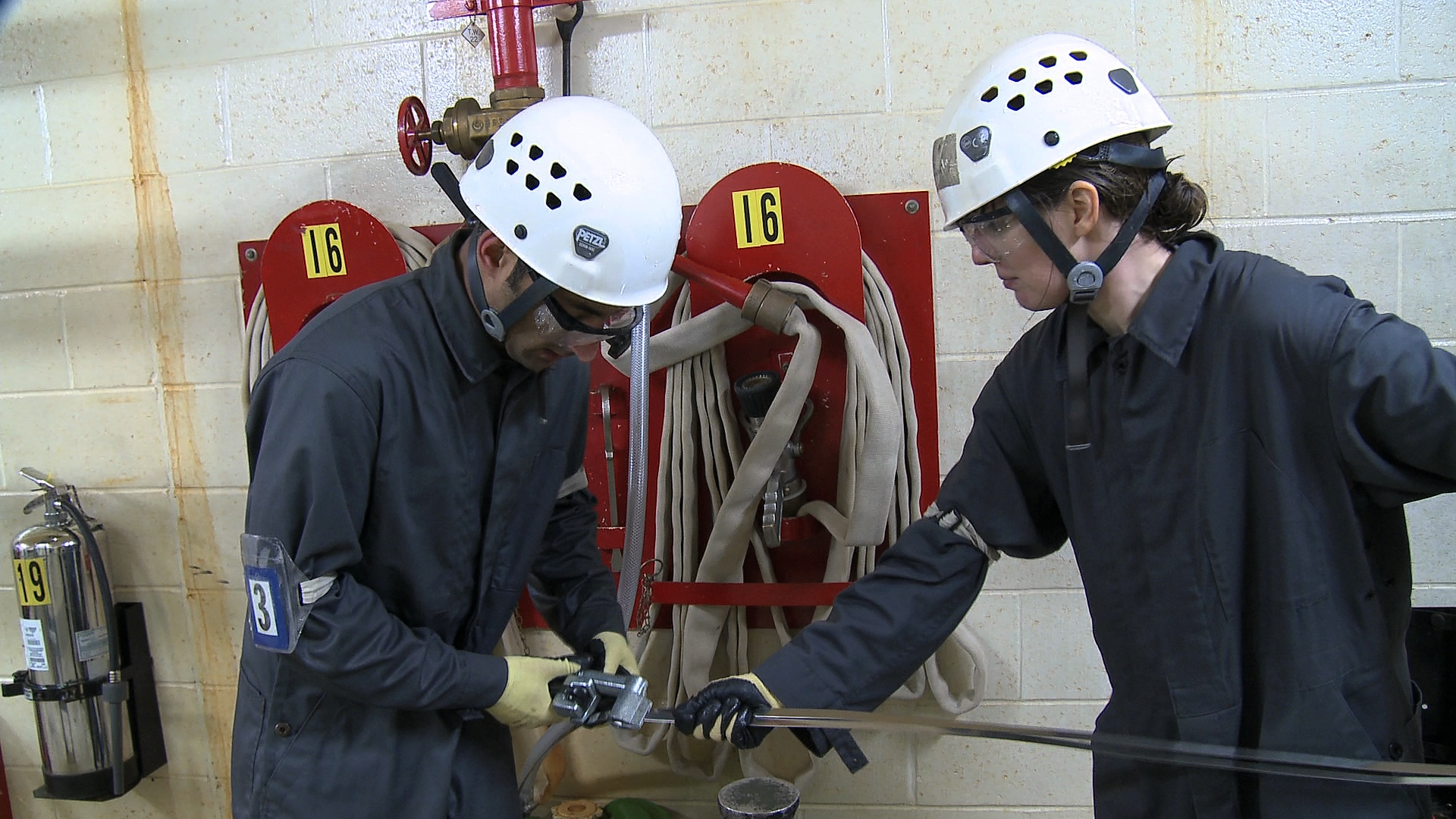 2009-02-18 – Dans le cadre de la campagne de recrutement d'astronautes de 2009, Jameel Janjua et Allison Hindle travaillent en équipe lors d’un exercice visant à réparer un tuyau endommagé à l’École du génie naval des Forces canadiennes, à Halifax (Nouvelle-Écosse. (Source : Agence spatiale canadienne.)