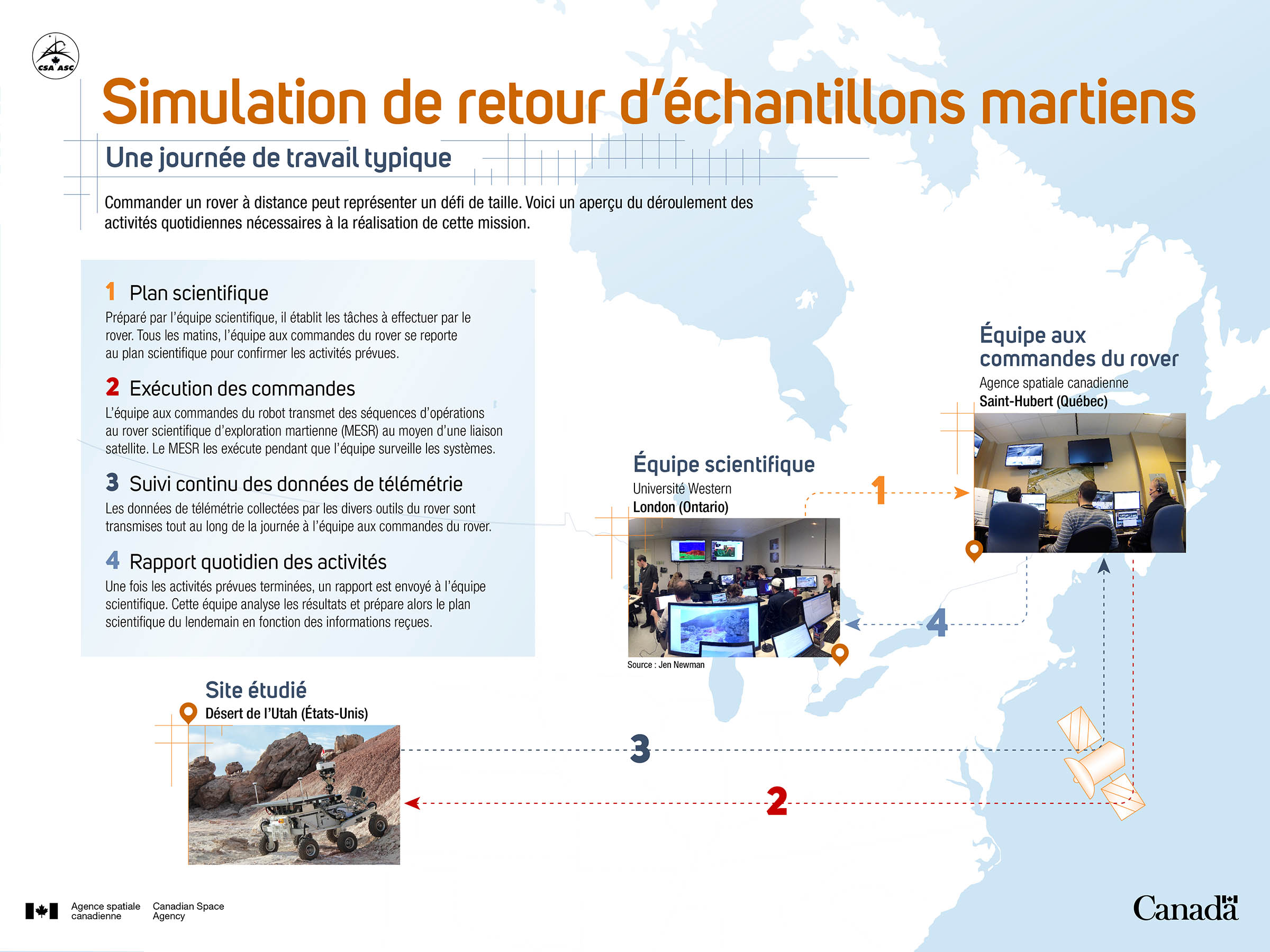 L'infographie contient trois photos reliées par des flèches montrant la séquence des activités quotidiennes. La première photo est celle d'un rover sur le site étudié dans le désert de l'Utah, aux États-Unis. La deuxième montre l'équipe scientifique dans un local de l'Université Western de London, en Ontario. La troisième photo montre l'équipe aux commandes du rover, dans une salle de l'Agence spatiale canadienne à Saint-Hubert, au Québec.
