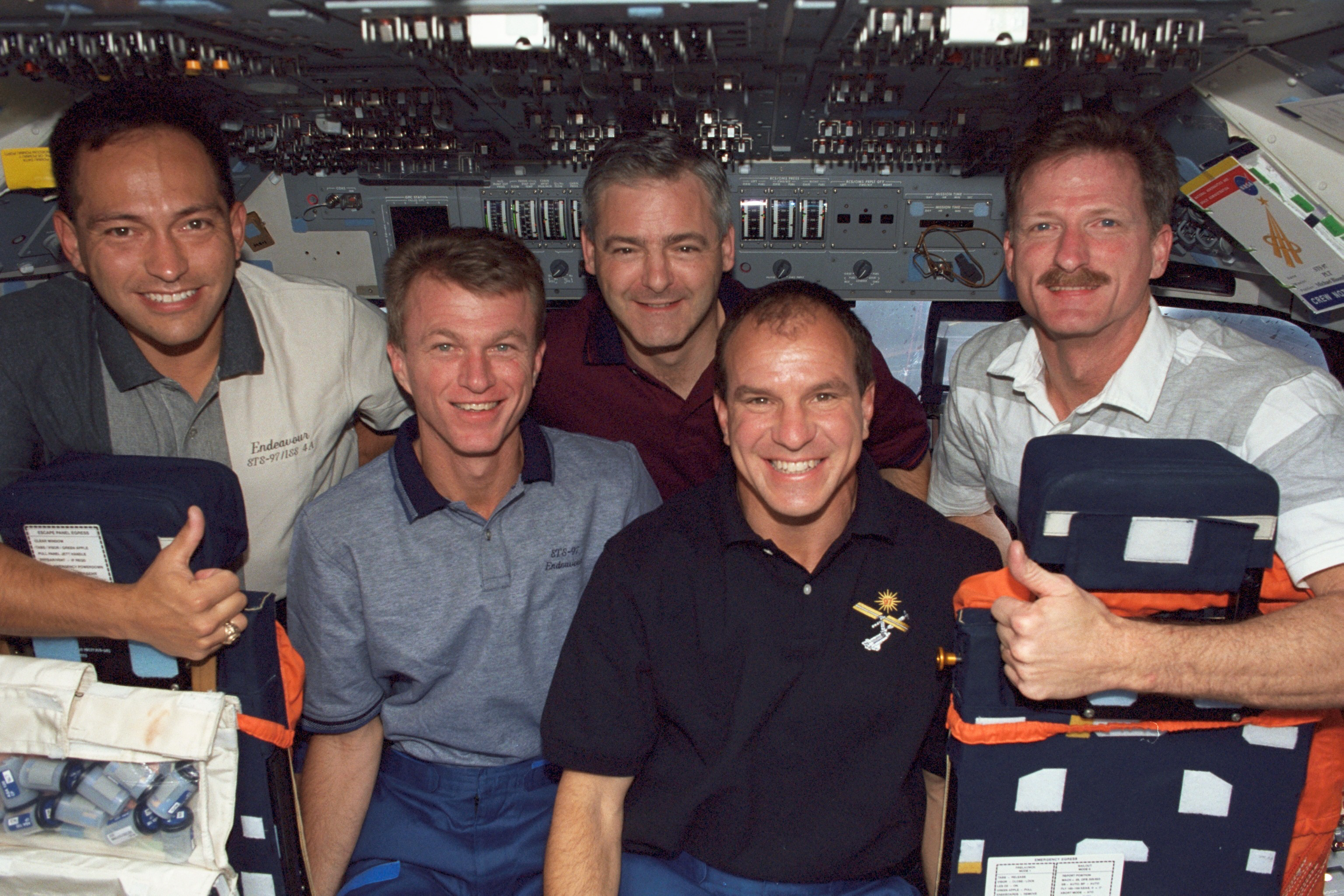 L’équipage de la mission STS-97 avec (de gauche à droite) Carlos Noriega, spécialiste de mission, Brent Jett Jr, commandant de mission, l’astronaute de l’Agence spatiale canadienne Marc Garneau, spécialiste de mission, Michael Bloomfield, pilote, et Joseph Tanner, spécialiste de mission, dans le poste de pilotage de la navette spatiale Endeavour. (Source : NASA.)