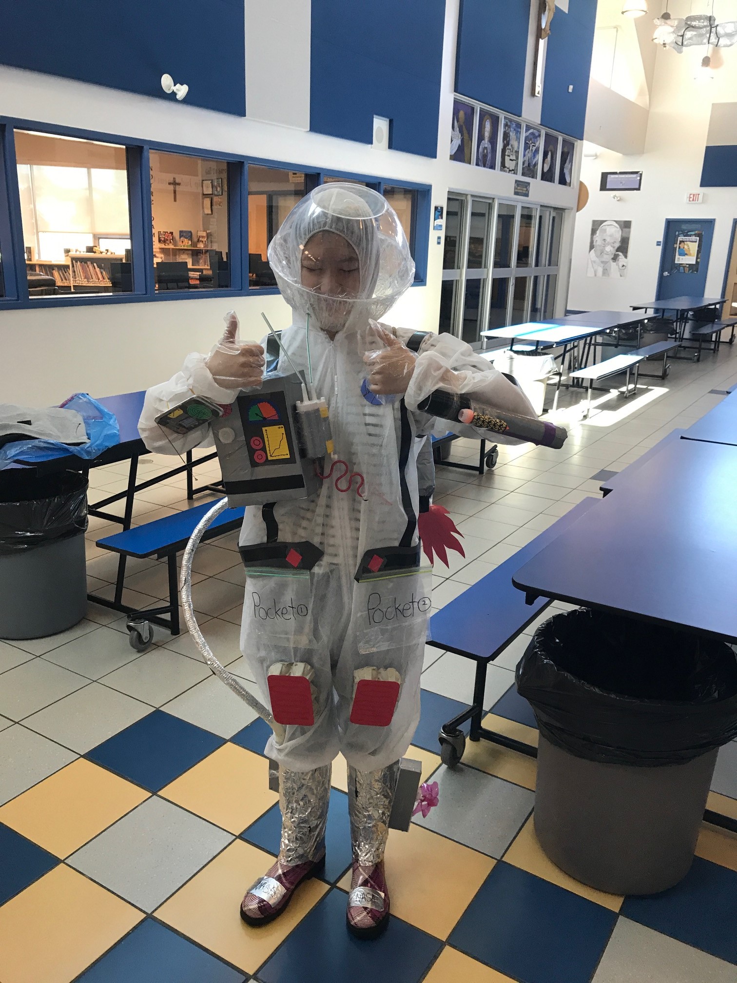 2017-05-29 - Des élèves de neuvième année de l'école Notre Dame Academy de Medicine Hat, en Alberta, se sont fabriqué une combinaison spatiale grâce aux conseils de l'Agence spatiale canadienne. (Source : Dana Marshall.)