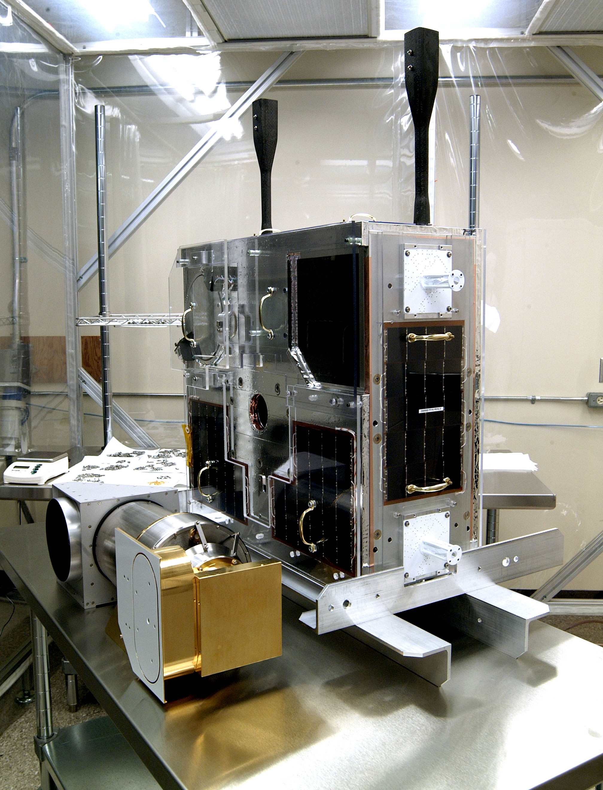 Cette photographie prise le 1er août 2002 nous permet de voir le télescope spatial devant le microsatellite MOST. Utilisé pour mesurer de façon très précise les variations de l’intensité lumineuse des étoiles, MOST permet aux scientifiques de sonder l’atmosphère de planètes extrasolaires, de déterminer l’âge des étoiles et, de ce fait, celui de l’Univers.