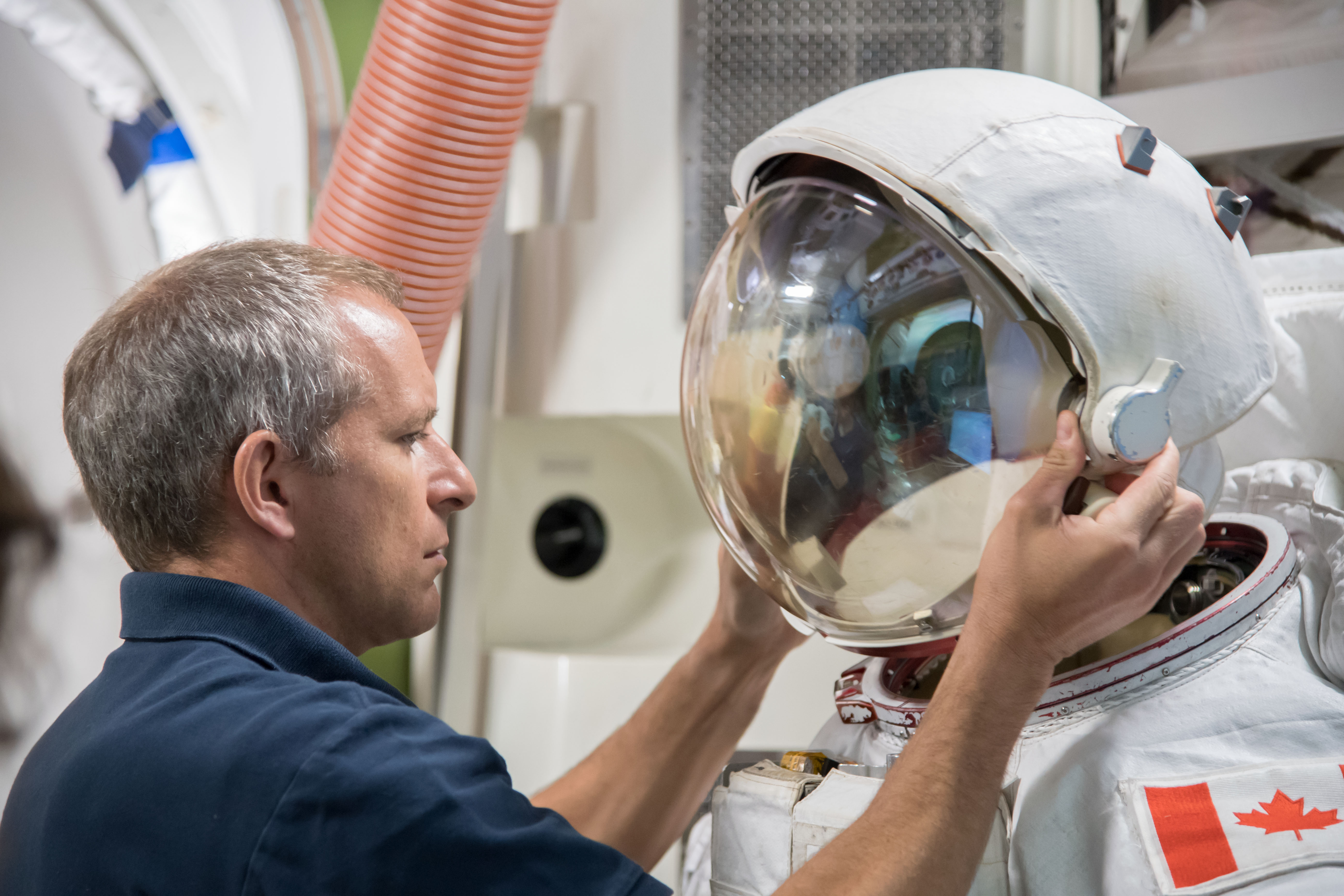 L’astronaute canadien David Saint-Jacques en formation dans le simulateur de sas de la Station spatiale internationale (SSI) au centre spatial Johnson (JSC) de la NASA