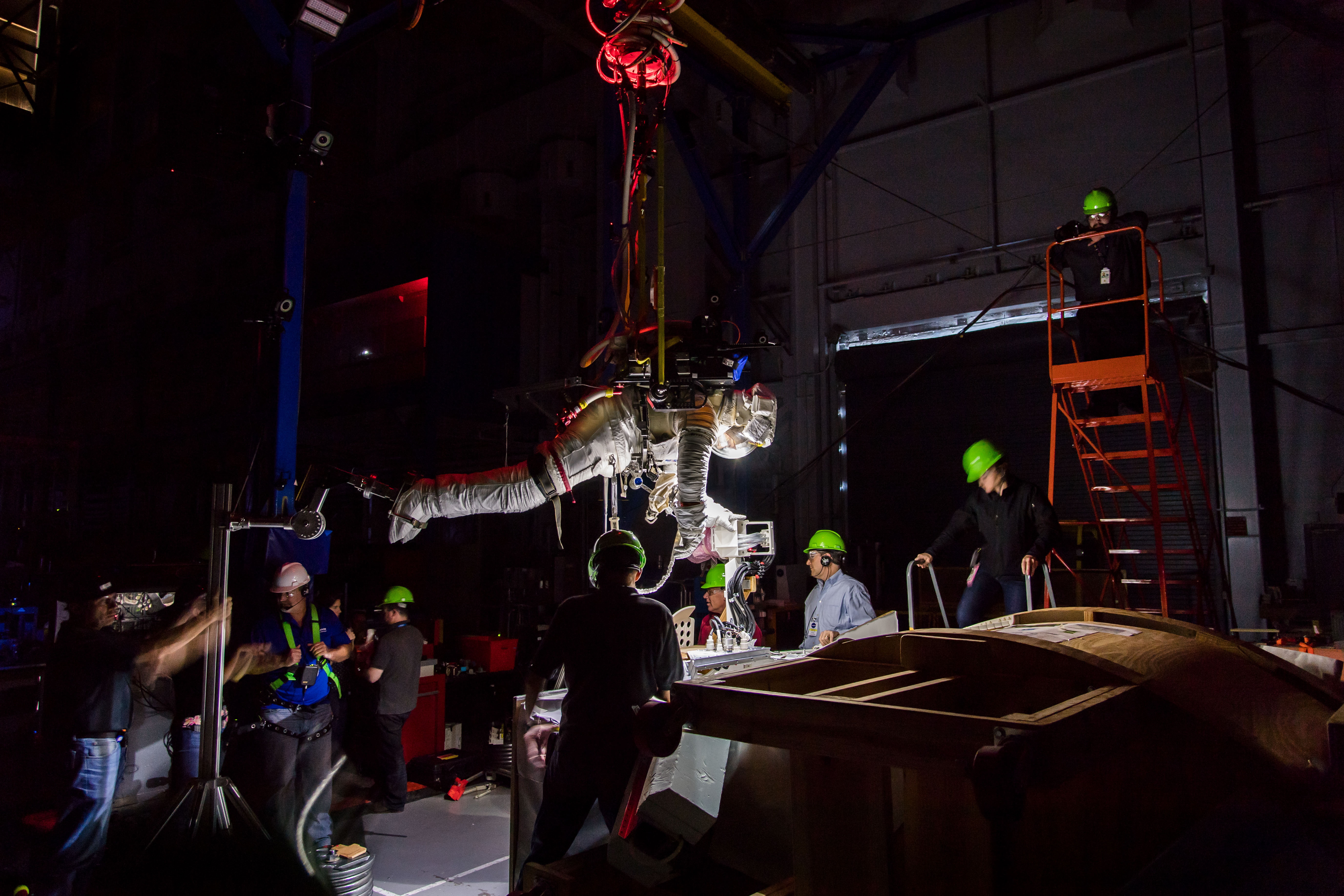 2017-10-31 – L’astronaute canadien Jeremy Hansen en test de sortie spatiale dans le simulateur de microgravité ARGOS au Centre spatial Johnson de la NASA. (Source : NASA/Josh Valcarcel.)